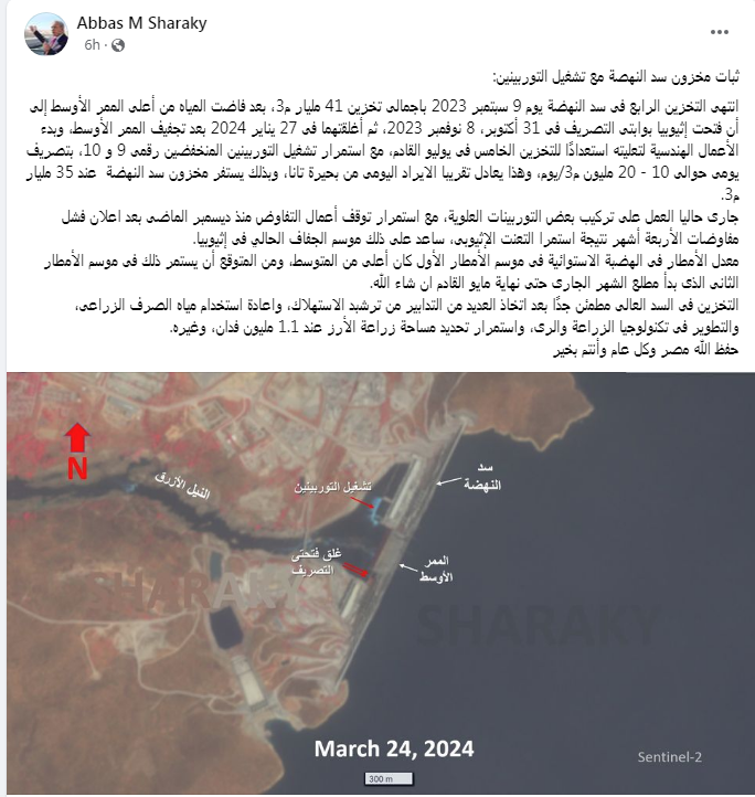 وقال الدكتور عباس شراقي عن التطور الحالي لـ أزمة سد النهضة: "ثبات مخزون سد النهضة مع تشغيل التوربينين: انتهى التخزين الرابع في سد النهضة يوم 9 سبتمبر 2023 بإجمالي تخزين 41 مليار م3، بعد فاضت المياه من أعلى الممر الأوسط إلى أن فتحت أثيوبيا بوابتي التصريف في 31 أكتوبر، 8 نوفمبر 2023، ثم أغلقتهما فى 27 يناير 2024 بعد تجفيف الممر الأوسط".