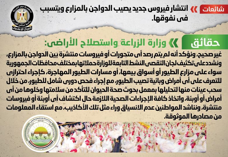 وقام المركز الإعلامي لمجلس الوزراء بالتواصل مع وزارة الزراعة واستصلاح الأراضي، والتي نفت تلك الأنباء، مُؤكدةً أنه لا صحة لانتشار فيروس جديد يصيب الدواجن بالمزارع ويتسبب في نفوقها، وأنه لم يتم رصد أي متحورات أو فيروسات منتشرة بين الدواجن بالمزارع.