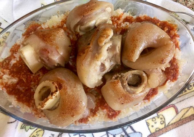 - يوضع الأرز والقليل من الصلصة وترص الكوارع فوق الطبق.