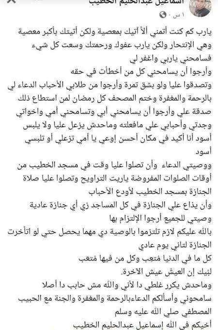 "وتصدقوا عليا ولو بشق تمرة وأرجو من طلابي الأحباب الدعاء لي بالرحمة والمغفرة وختم المصحف كل رمضان لمن استطاع".. بتلك الكلمات استكمل محفظ القرآن في سوهاج وصيته مدونً: ذلك صدقة علي وأرجو أن يسامحني أبي وتسامحني أمي وأخواتي وجدتي وأحبابي على مافعلته وماحدش يزعل عليا ولا يلبس أسود، أنا أكيد في مكان أحسن إوعي يا أمي تزعلي أو تلبسي أسود».