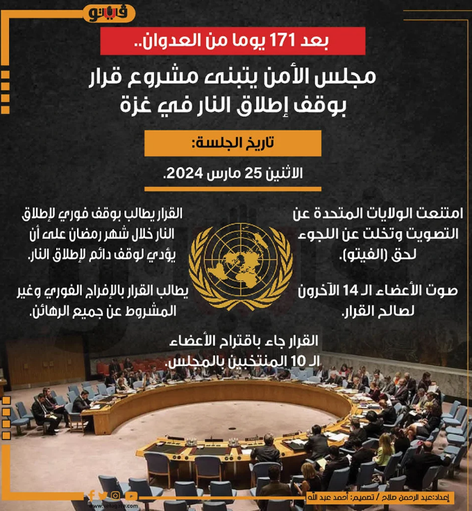 مجلس الأمن الدولي، تبنى مجلس الأمن الدولي الاثنين قراره الأول بعد 171 يوما من العدوان الإسرائيلي الغاشم علي قطاع غزة الذي يطالب فيه بـ"وقف فوري لإطلاق النار" في غزة.