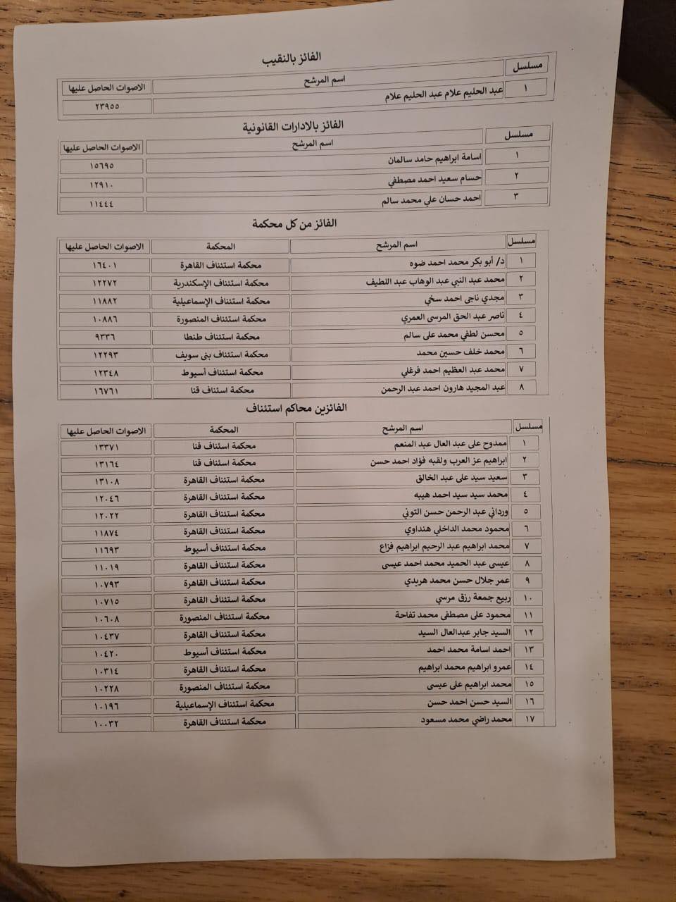 أعلنت اللجنة القضائية المشرفة على انتخابات نقابة المحامين، برئاسة المستشار الدكتور محمد أبو ضيف، نائب رئيس هيئة النيابة الإدارية، نتيجة فوز أعضاء مجلس النقابة وهم ٣ أعضاء عن الإدارات القانونية، و٢٥ عضوًا عن محاكم الاستئناف على مستوى الجمهورية.