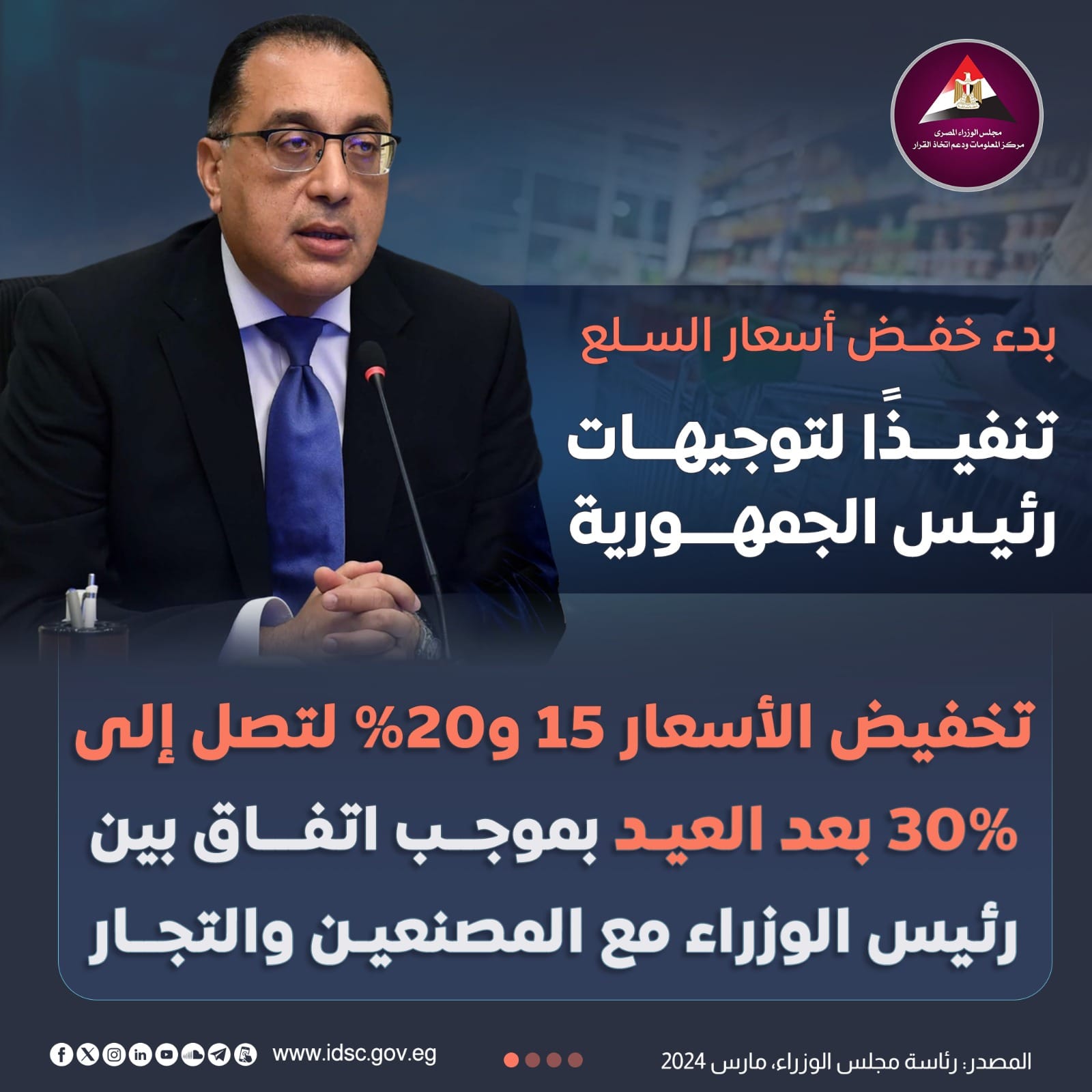 حيث اتفق رئيس الوزراء الدكتور مصطفى مدبولي مع المصنعين والتجار للإعلان عن بدء خفض أسعار السلع بـ 15 و20 % ليصل التخفيض إلى 30 % بعد العيد، موجها بنزول فرق عمل من مجلس الوزراء للتأكد من تطبيق خفض الأسعار بالسلاسل التجارية والسوبر ماركت.