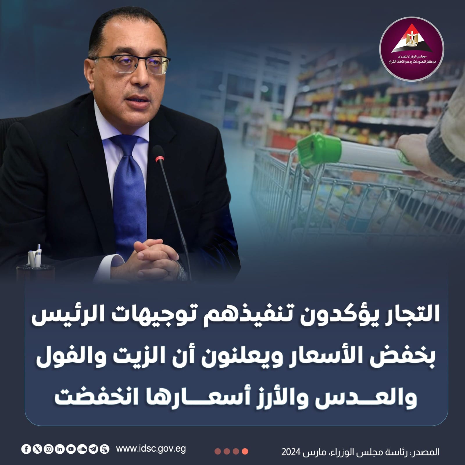 أكد التجار لرئيس الوزراء خلال الاجتماع تنفيذهم توجيهات الرئيس بخفض الأسعار قائلين: الزيت والفول والعدس والأرز أسعارها انخفضت ووجه رئيس الوزراء بنزول فرق عمل من مجلس الوزراء للتأكد من تطبيق خفض الأسعار بالسلاسل التجارية والسوبر ماركت.
