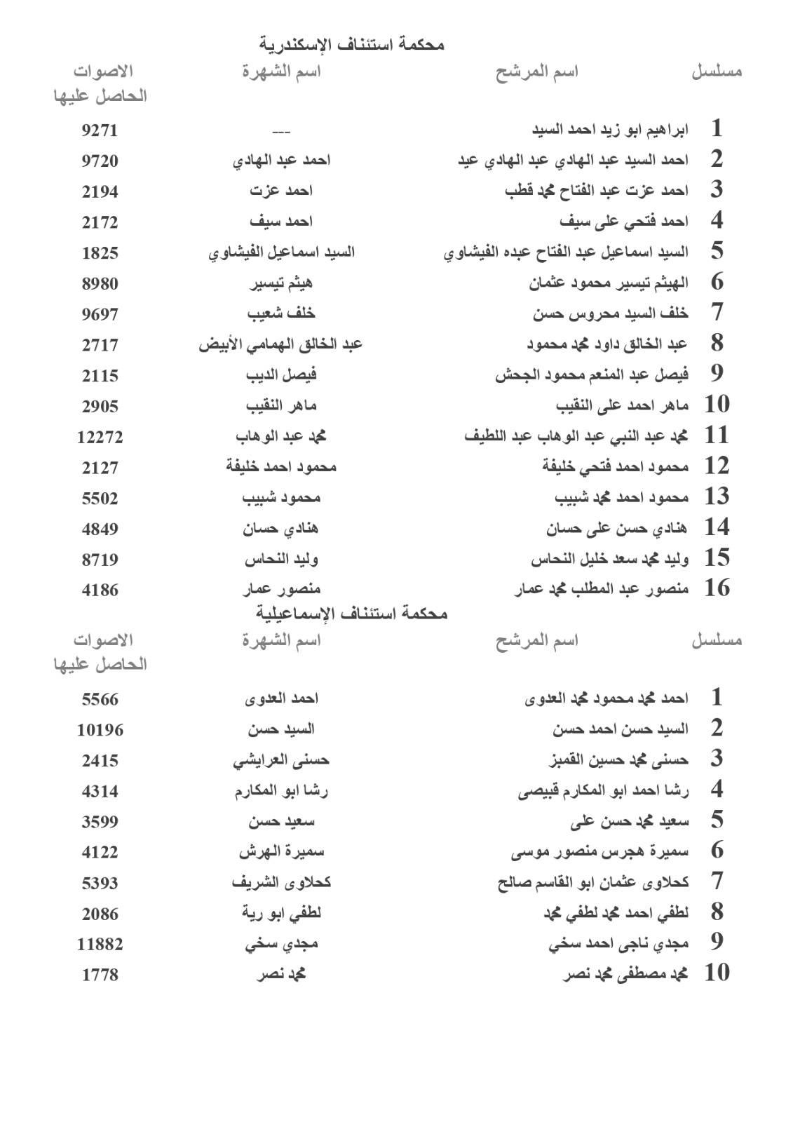 وأسفرت عمليات رصد وتجميع نتائج الفرز من اللجان العامة على مستوى الجمهورية عن التالي:
