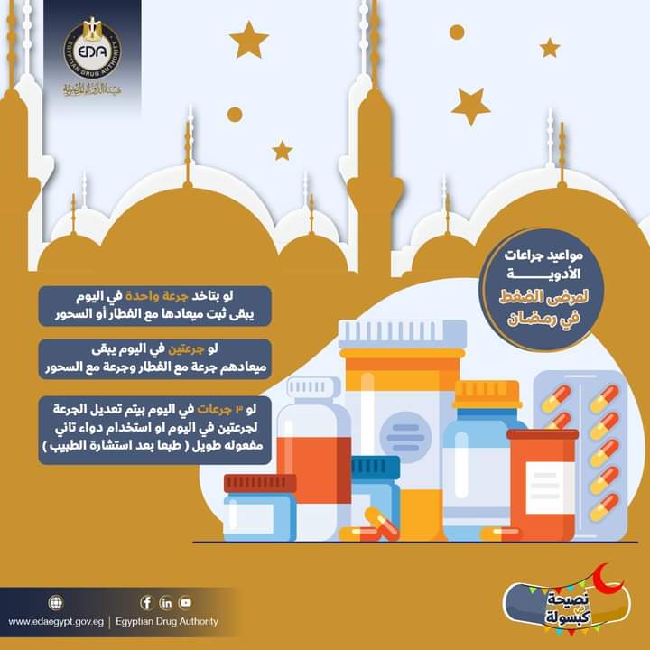 وأوضحت هيئة الدواء المصرية، أن المريض الذي يأخذ جرعة واحدة من دواء علاج الضغط يمكنه تثبيت الجرعة سواء مع وجبة الإفطار أو السحور بينما إذا كان المريض يحصل علي جرعتين في اليوم يمكنه تثبيت مواعيدهم في وجبتي الإفطار والسحور.