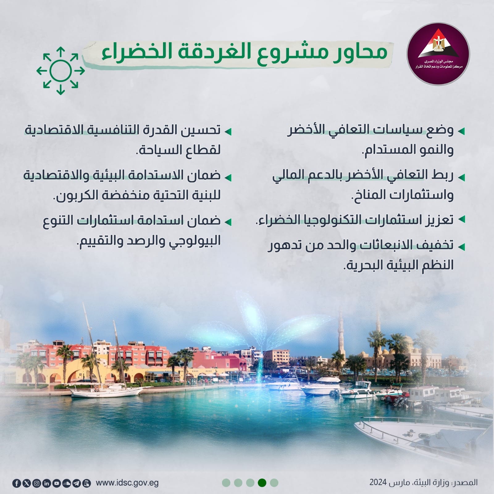 كشفت الصفحة الرسمية لمركز المعلومات ودعم اتخاذ القرار بمجلس الوزراء على موقع التواصل الاجتماعي "فيسبوك" دور وزارة البيئة في مشروع "الغردقة الخضراء".
