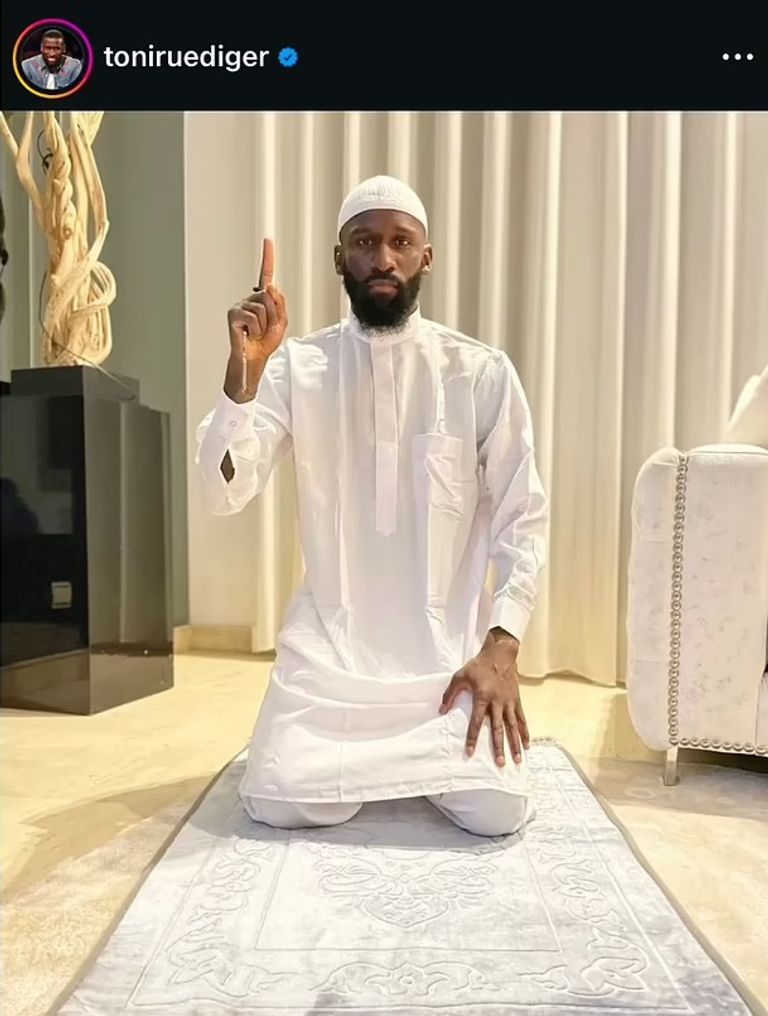 وفي التفاصيل، نشر أنطونيو روديجر، الذي يعتنق الدين الإسلامي، الأسبوع الماضي صورة له وهو يصلي ويبتهل برداء أبيض على سجادة الصلاة.