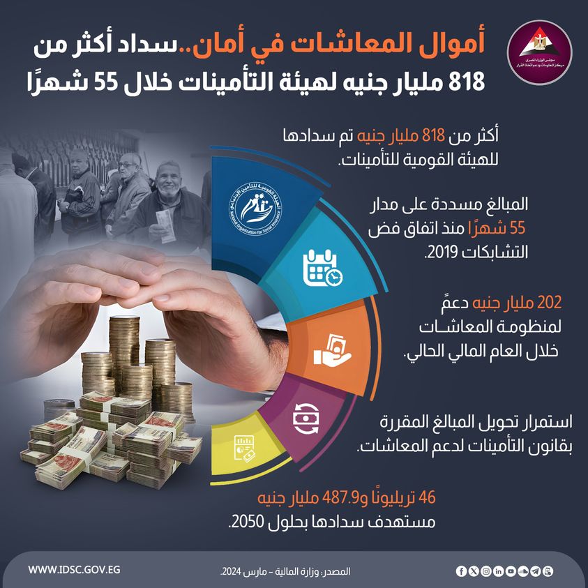 كشفت الصفحة الرسمية لمركز المعلومات ودعم اتخاذ القرار بمجلس الوزراء على موقع التواصل الاجتماعي "فيسبوك" عن سداد أكثر من 818 مليار جنيه لهيئة التأمينات خلال 55 شهرا وذلك لتأمين صرف المعاشات.