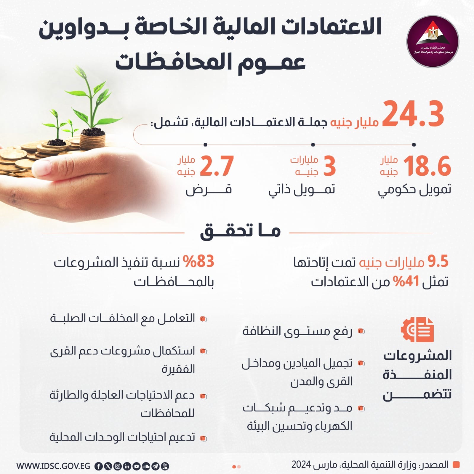 24.3 مليار جنيه، الاعتمادات المالية الخاصة بدواوين المحافظات (إنفوجراف)