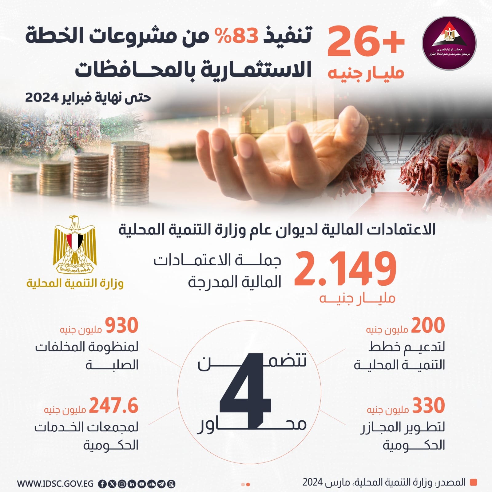 تطوير ورفع كفاءة المجازر الحكومية بتكلفة ٣٣٠ مليون جنيه، ثالثًا منظومة المخلفات الصلبة بتكلفة ٩٣٠ مليون جنيه، رابعًا مجمعات الخدمات الحكومية بتكلفة ٢٤٧,٦ مليون جنيه، مشيرًا إلى أن هذه البرامج تهدف إلى الإسراع برفع معدلات التنمية في المحافظات حيث أن مشروعات الخطة تؤكد أهمية الالتزام بتطبيق معايير الكفاءة والفاعلية في تحديد الأولويات الاستثمارية وضمان عدالة التوزيع وذلك لتعظيم العائد من الاستثمارات العامة.