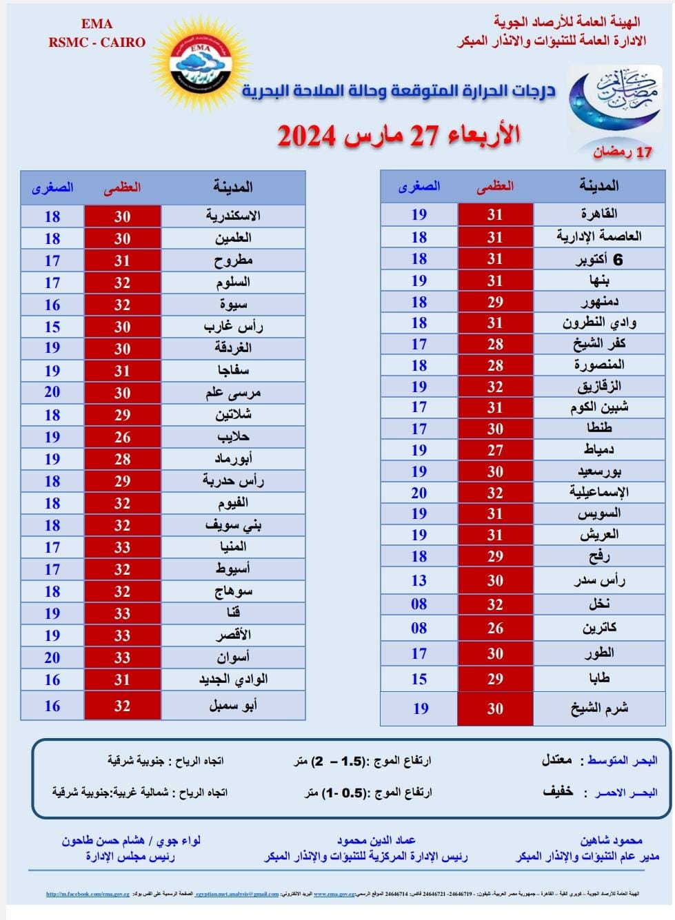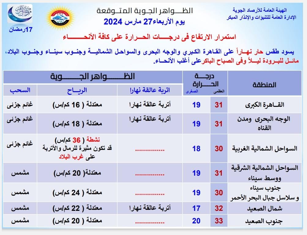 كما كشفت هيئة الأرصاد الجوية عن متوسط درجات الحرارة المتوقعة اليوم الأربعاء 27- 03-2024.