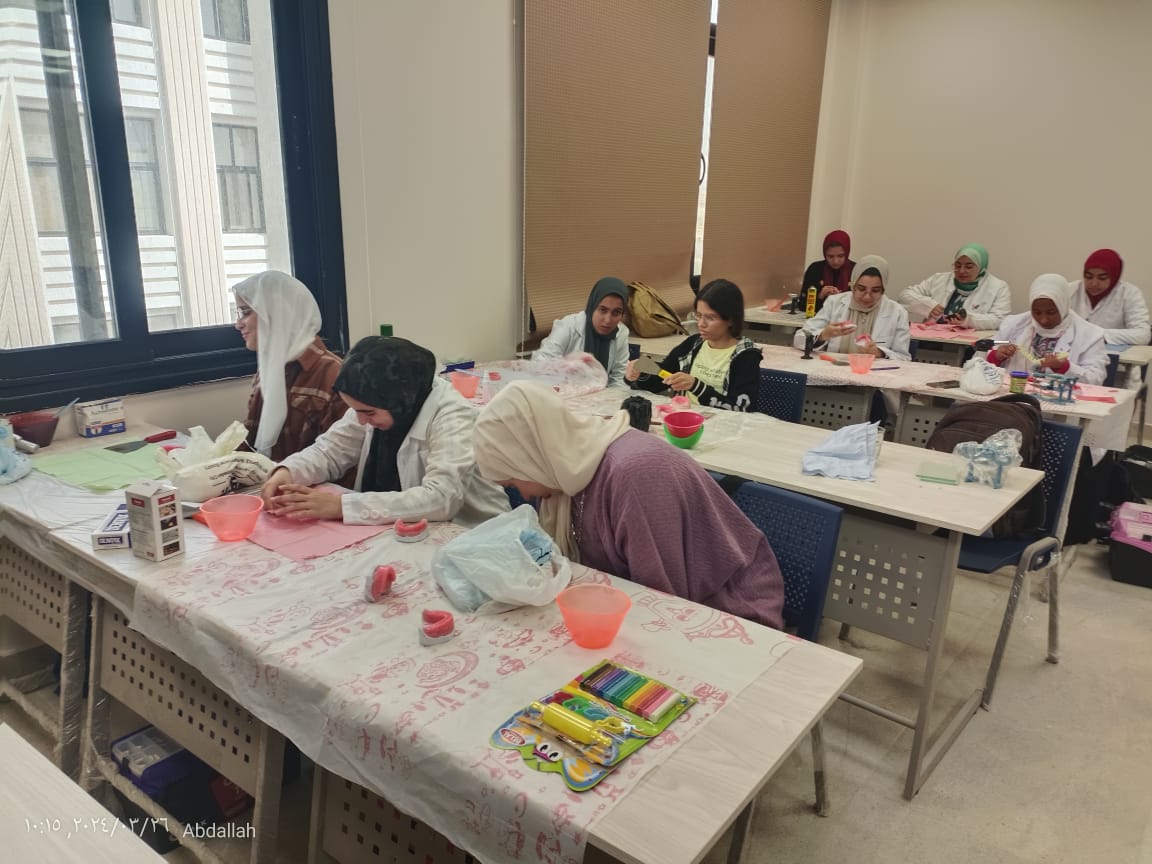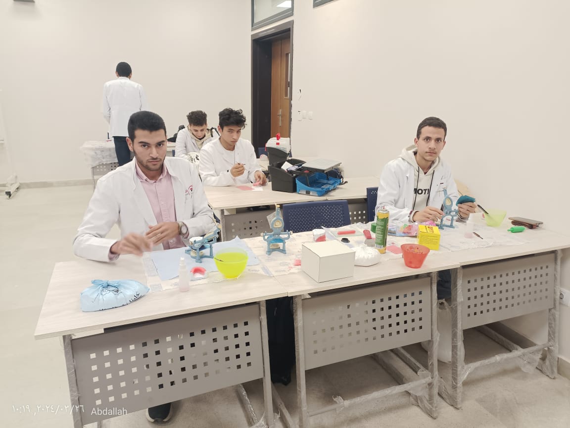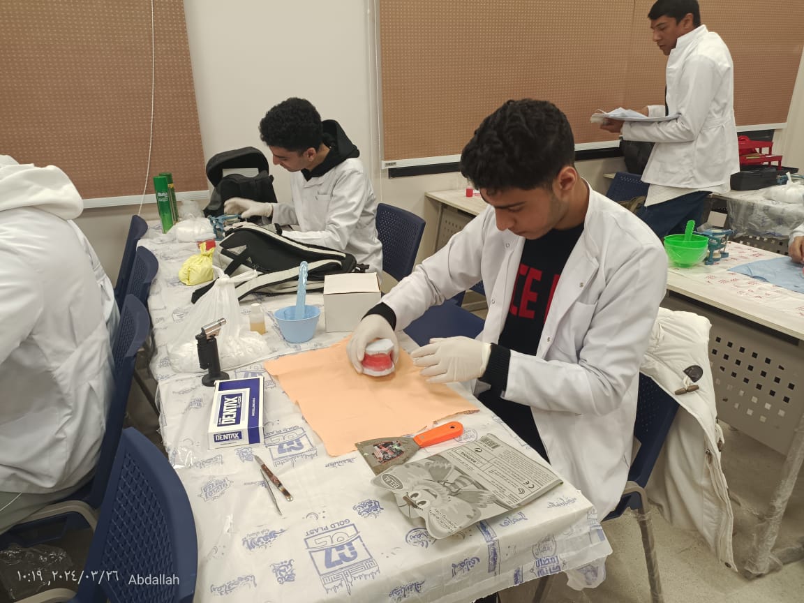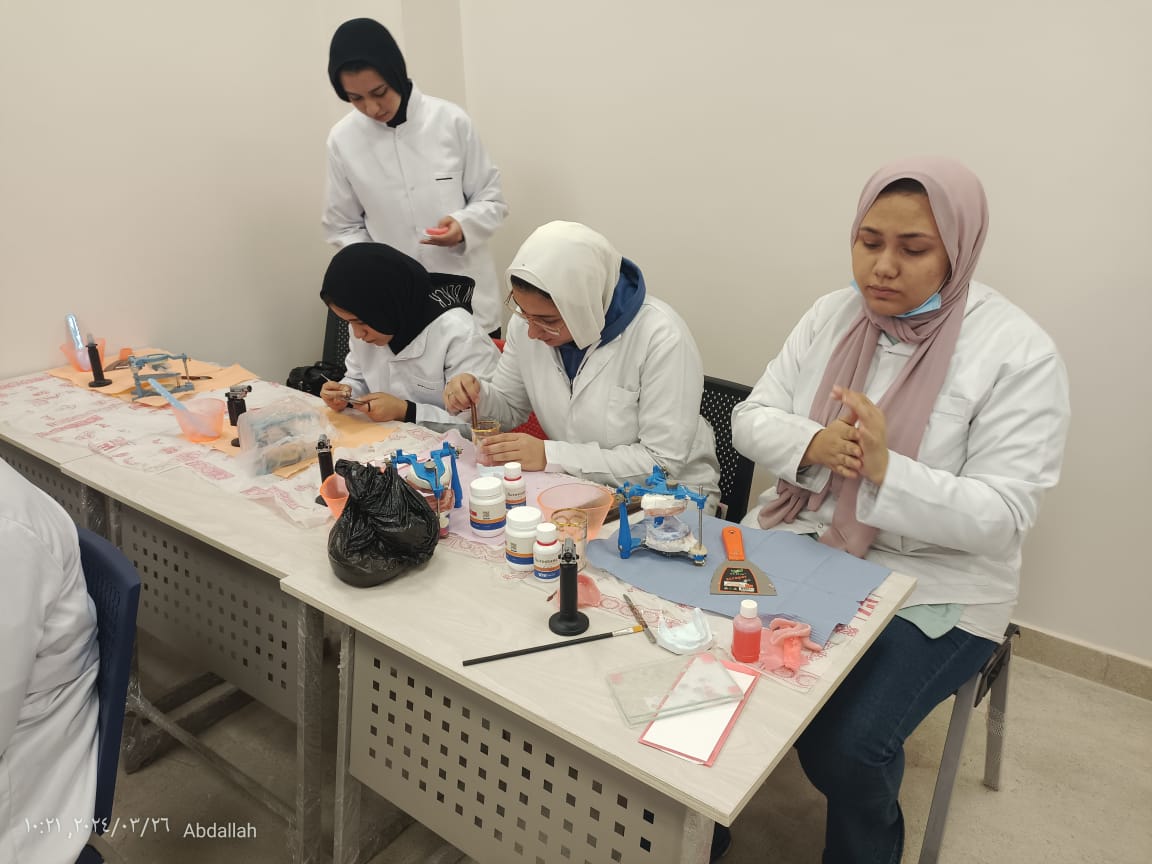 وأشارت الدكتورة ميرهان نبيه منسق برامج طب الأسنان إلى أنه يتم تقييم ومتابعة الطلاب من خلال منهج متسلسل بدراسة الخطوات المعملية والتي بدورها يتم تصنيع طقم كامل متحرك كجهاز تعويضي لحالة فقد الاسنان بالكامل،وعلى كل طالب تسليم موديل تعليمي يحاكي حالة فقد أسنان بالكامل ليتابع عليه في كل درس عملي خطوات تصنيع التركيبة المتحركة.