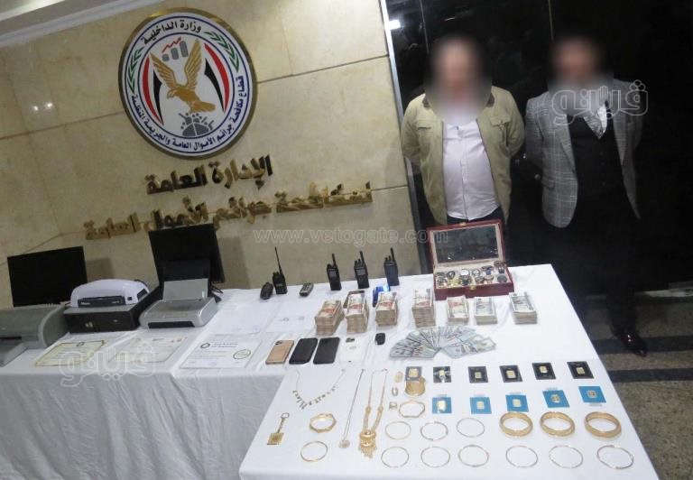 و أمكن ضبطهما وعثر بحوزتهما على (عدد من الأجهزة اللاسلكية – 2 نموذج خاتم شعار الجمهورية "مقلدان" - كارت تصريح مقابلة خالى البيانات "مزور" – عدد من الشهادات الدراسية منسوبة لكيانات وهمية - طلبات خاصة بضحاياهم موجهة لجهات حكومية "تعيين وظائف، تخصيص قطع أراضى" – عدد من المشغولات والسبائك الذهبية بإجمالى 651 جرام – عدد من ساعات اليد – الأجهزة المستخدمة فى عمليات التزوير - مبالغ مالية عملات "محلية وأجنبية" – سيارة).