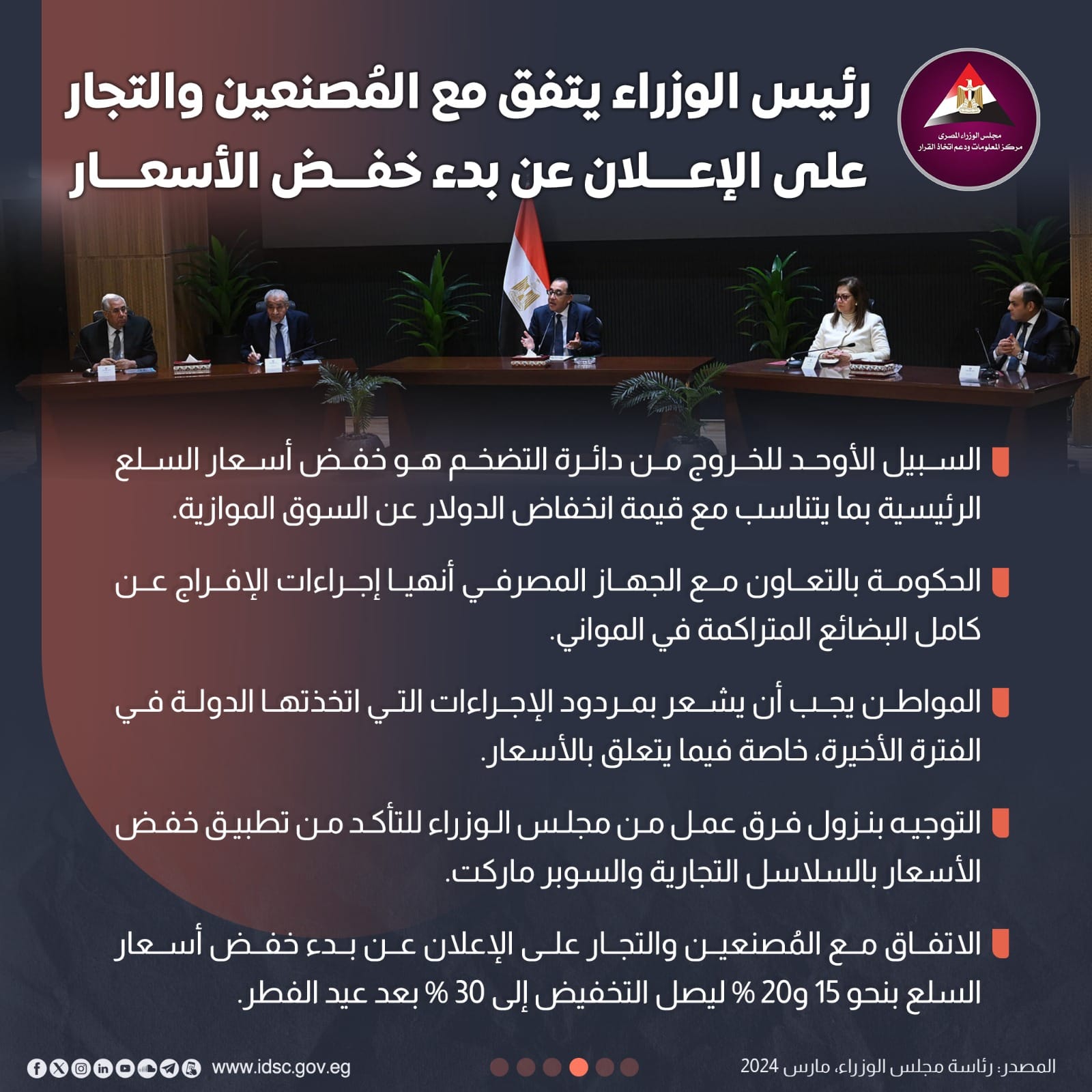 رئيس الوزراء يتفق مع المصنعين والتجار على خفض الأسعار