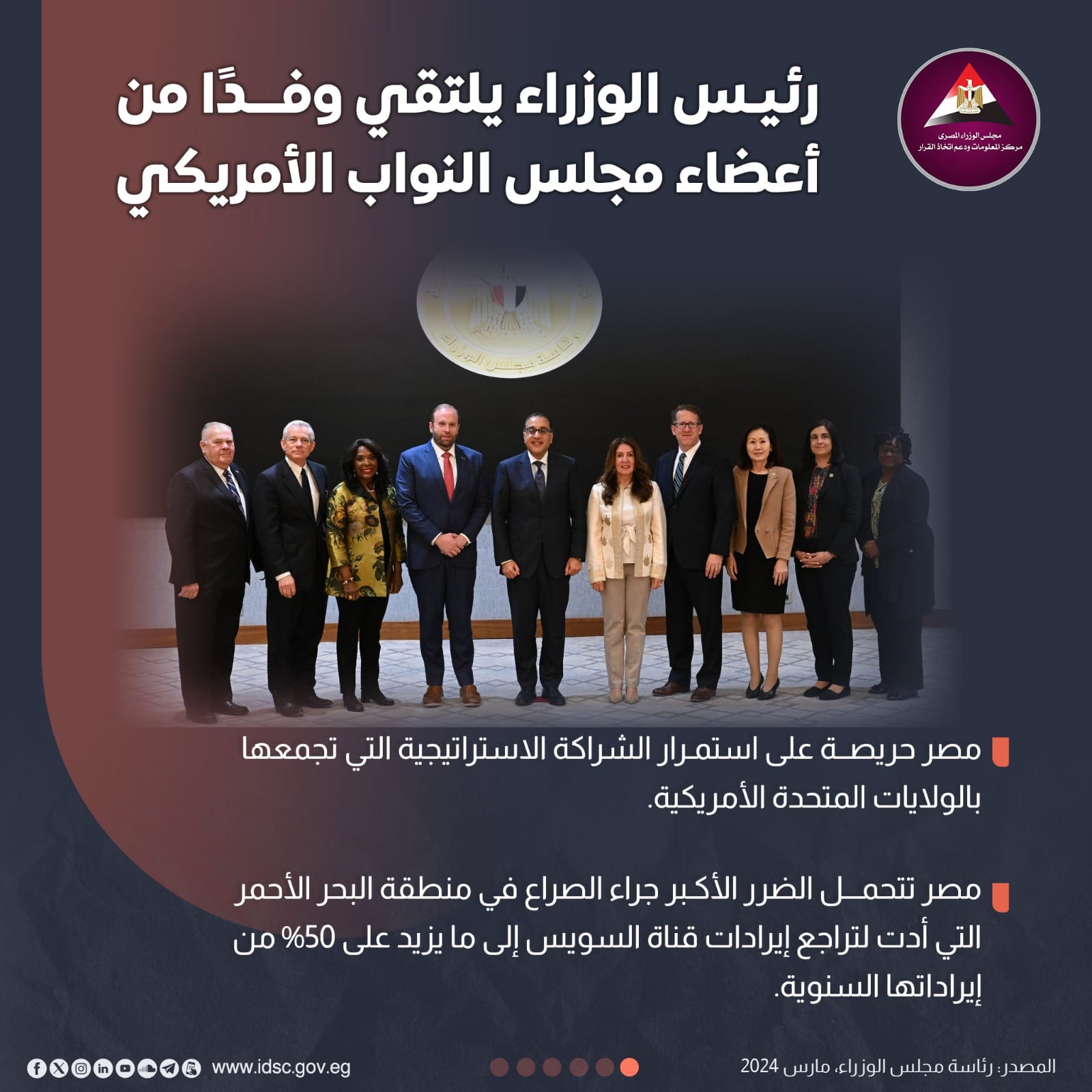 وفي مستهل الاجتماع، أكد رئيس الوزراء حرص مصر على استمرار الشراكة الإستراتيجية التي تجمعها بالولايات المتحدة الأمريكية، منوهًا بتعدد أوجه ومجالات التعاون القائمة بين البلدين على أساس من الاحترام المتبادل والمصلحة المشتركة، مؤكدًا في الوقت نفسه العلاقات الوثيقة بين الجانبين على مستوى الكونجرس الأمريكي بحزبيه الجمهوري والديمقراطي، على حد سواء.