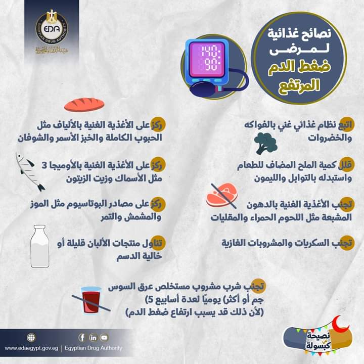 ووجهت هيئة الدواء المصرية نصائح غذائية لمرضي ضغط الدم المرتفع منها: