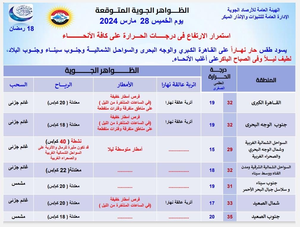 تقلبات جوية وموجة حارة وأمطار، هكذا وصفت هيئة الأرصاد الجوية، حالة الطقس اليوم الخميس 28- 3- س 2024.