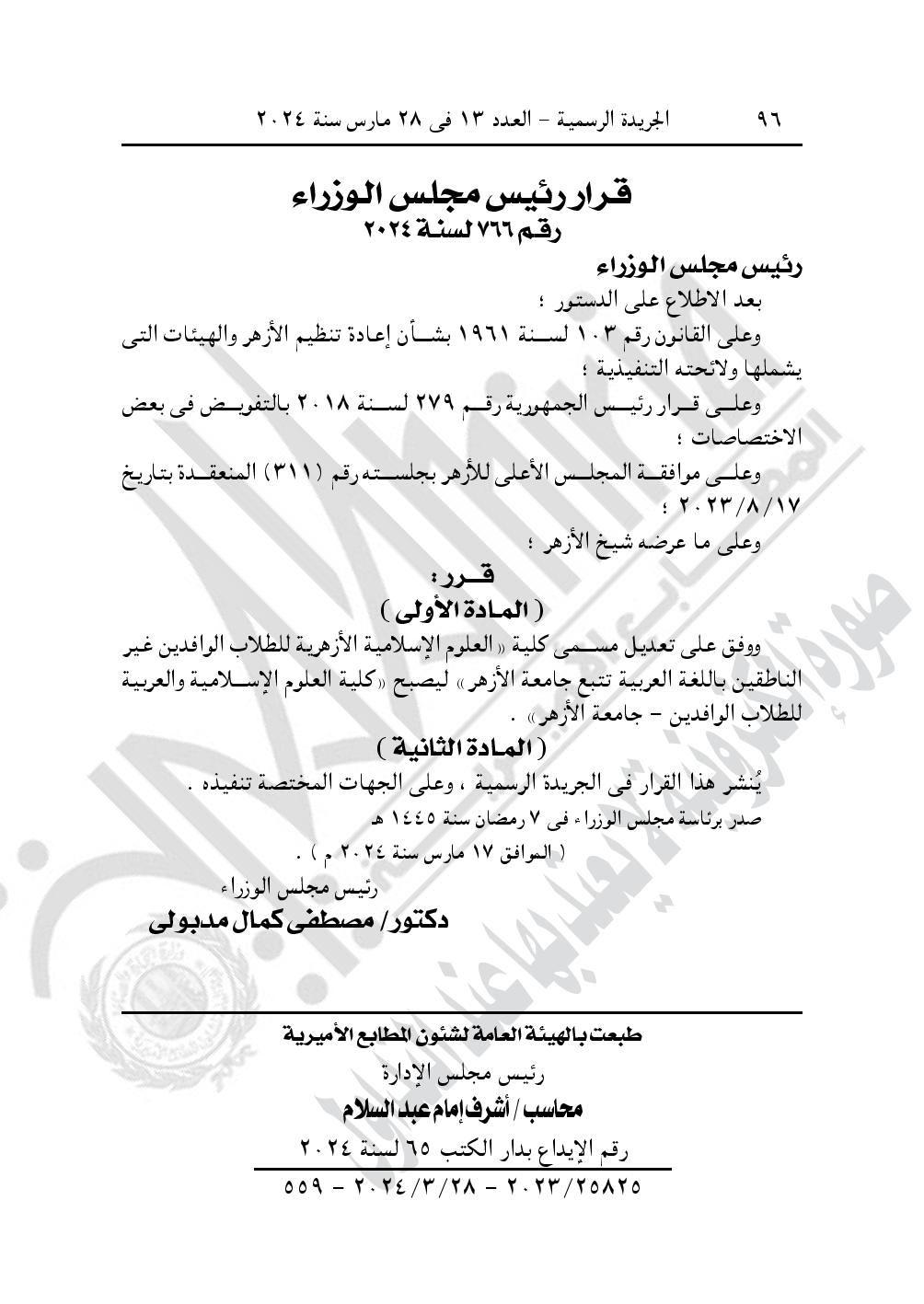 -قرار رئيس مجلـس الـوزراء رقـم 766 لسنـة 2024، بشأن الموافقة على تعديل مسمى كلية "العلوم الإسلامية الأزهرية للطلاب الوافدين غير الناطقين باللغة العربية تتبع جامعة الأزهر ليصبح "كلية العلوم الإسلامية والعربية للطلاب الوافدين- جامعة الأزهر".