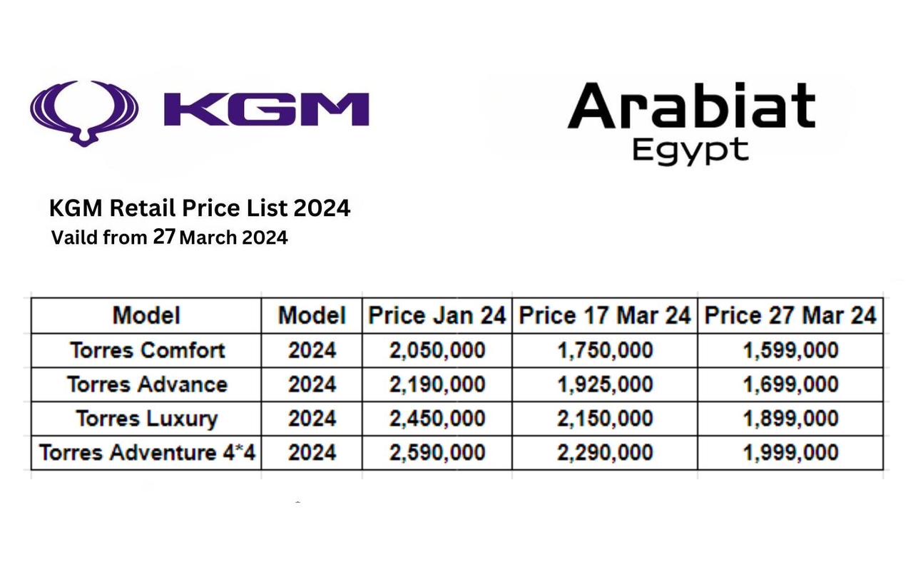 أعلن وكيل سيارات KGM الكورية، عن تراجع أسعار طرازات توريس خلال شهر مارس الحالي، بقيمة وصلت إلى 590 ألف جنيه بسبب تراجع سعر الدولار وفتح الاستيراد.