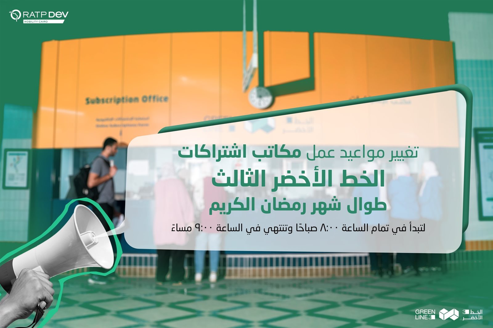 من ناحية أخرى، قررت الشركة المشغلة للخط الأخضر الخط الثالث تعديل مواعيد عمل مكاتب الاشتراكات بمحطات عدلي منصور، العباسية، العتبة، وهليوبوليس مؤقتًا طوال شهر رمضان الكريم، لتبدأ في تمام الساعة 8:00 صباحًا وتنتهي في الساعة 9:00 مساءً.