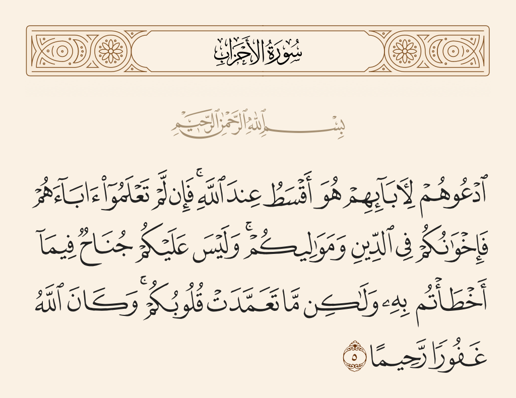 وبعدما شهد أهل زيد هذا الموقف، عادوا من حيث أتوا، وبقي حال زيد على ما هو عليه حتى نزلت الآية الكريمة التي تقول: «ادْعُوهُمْ لِآَبَائِهِمْ هُوَ أَقْسَطُ عِنْدَ اللَّهِ فَإِنْ لَمْ تَعْلَمُوا آَبَاءَهُمْ فَإِخْوَانُكُمْ فِي الدِّينِ وَمَوَالِيكُمْ وَلَيْسَ عَلَيْكُمْ جُنَاحٌ فِيمَا أَخْطَأْتُمْ بِهِ وَلَكِنْ مَا تَعَمَّدَتْ قُلُوبُكُمْ وَكَانَ اللَّهُ غَفُورًا رَحِيمًا» (الأحزاب: 5).