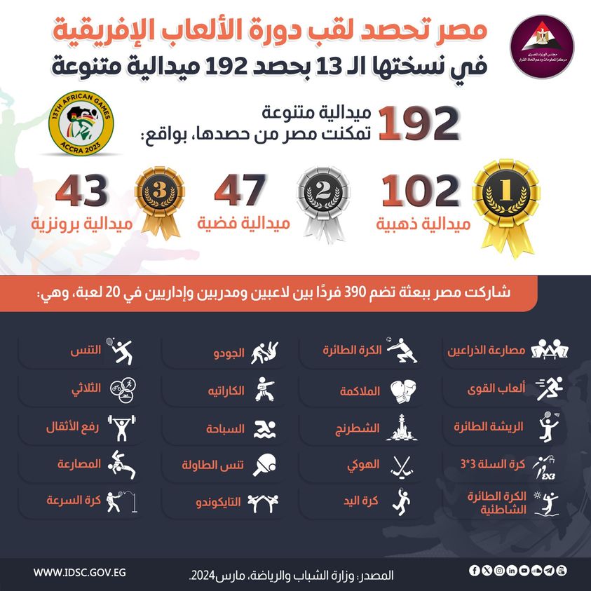 بـ 192 ميدالية متنوعة، مصر تحصد لقب دورة الألعاب الأفريقية (إنفوجراف)