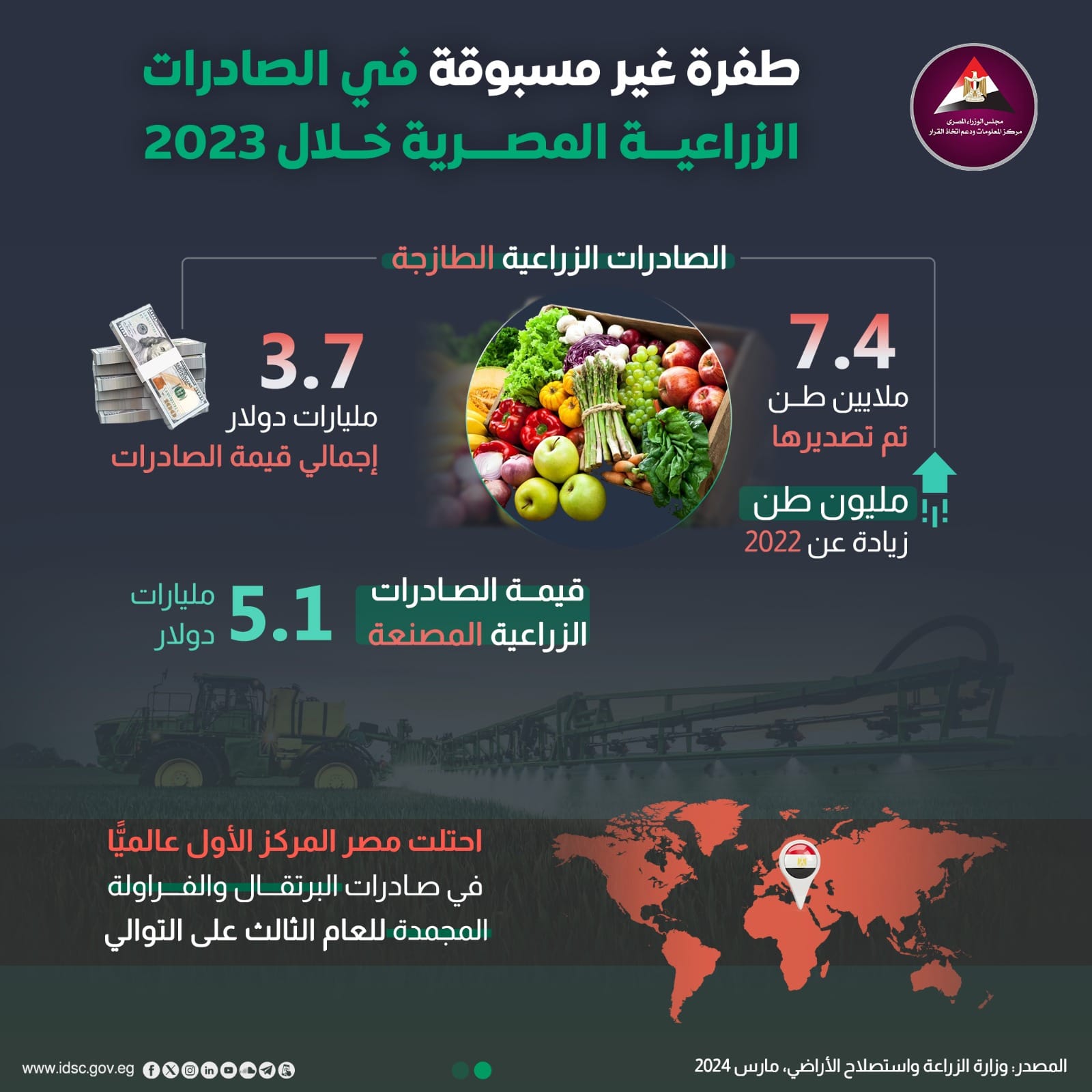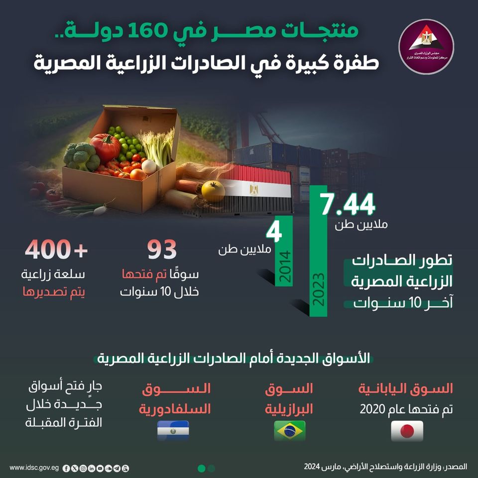 كشفت الصفحة الرسمية لمركز المعلومات ودعم اتخاذ القرار بمجلس الوزراء على موقع التواصل الاجتماعي "فيسبوك" عن الطفرة الكبيرة التي شهدتها الصادرات الزراعية المصرية حيث تم تصدير المنتجات الزراعية إلى 160 دولة حول العالم.
