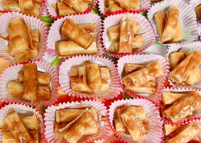 - ثم نضع فوقها طبقة أخري من ورق الجلاش وتدهن سمن أو زبد.