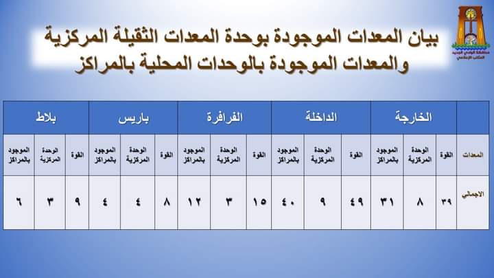 وأكدت محافظة الوادي الجديد، أن خطة تدعيم الوحدة بالمعدات تشمل كافة المراكز من خلال المراجعة الدقيقة لموقف وحالة المعدات المستخدمة بكل مركز، لضمان حسن استغلال الموارد المتاحة وإدارة الأزمات بكفاءة وفاعلية.