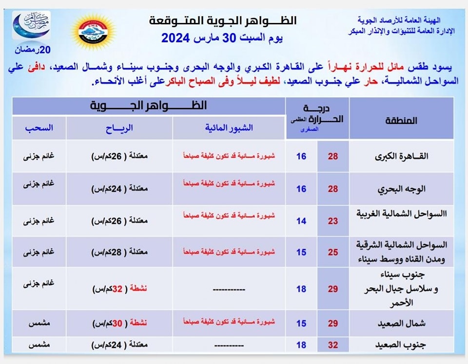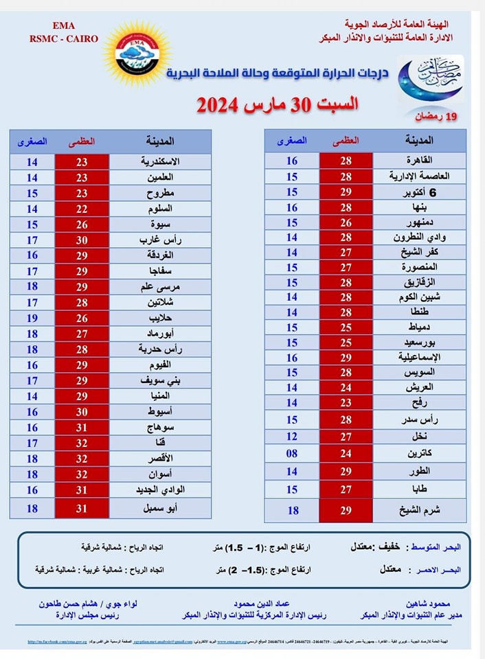 كما نشر هيئة الأرصاد بيانا بدرجات الحرارة المتوقعة اليوم السبت، والتي جاءت كالتالي: