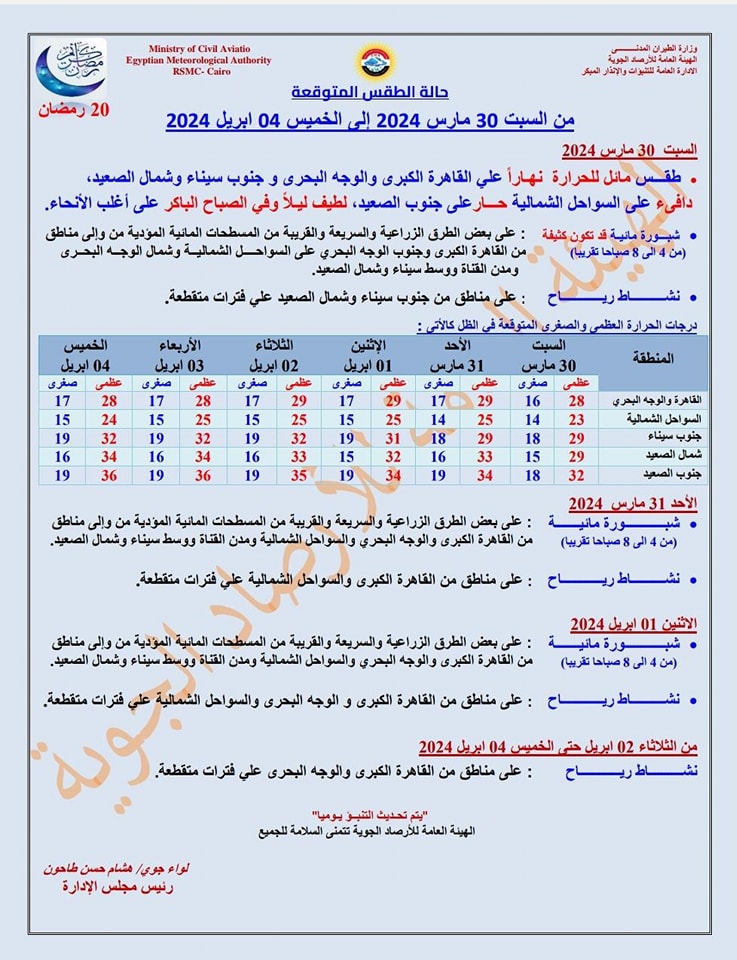 وبالنسبة لطقس ودرجات الحرارة المتوقعة للأسبوع المقبل، فقد جاء كالتالي: