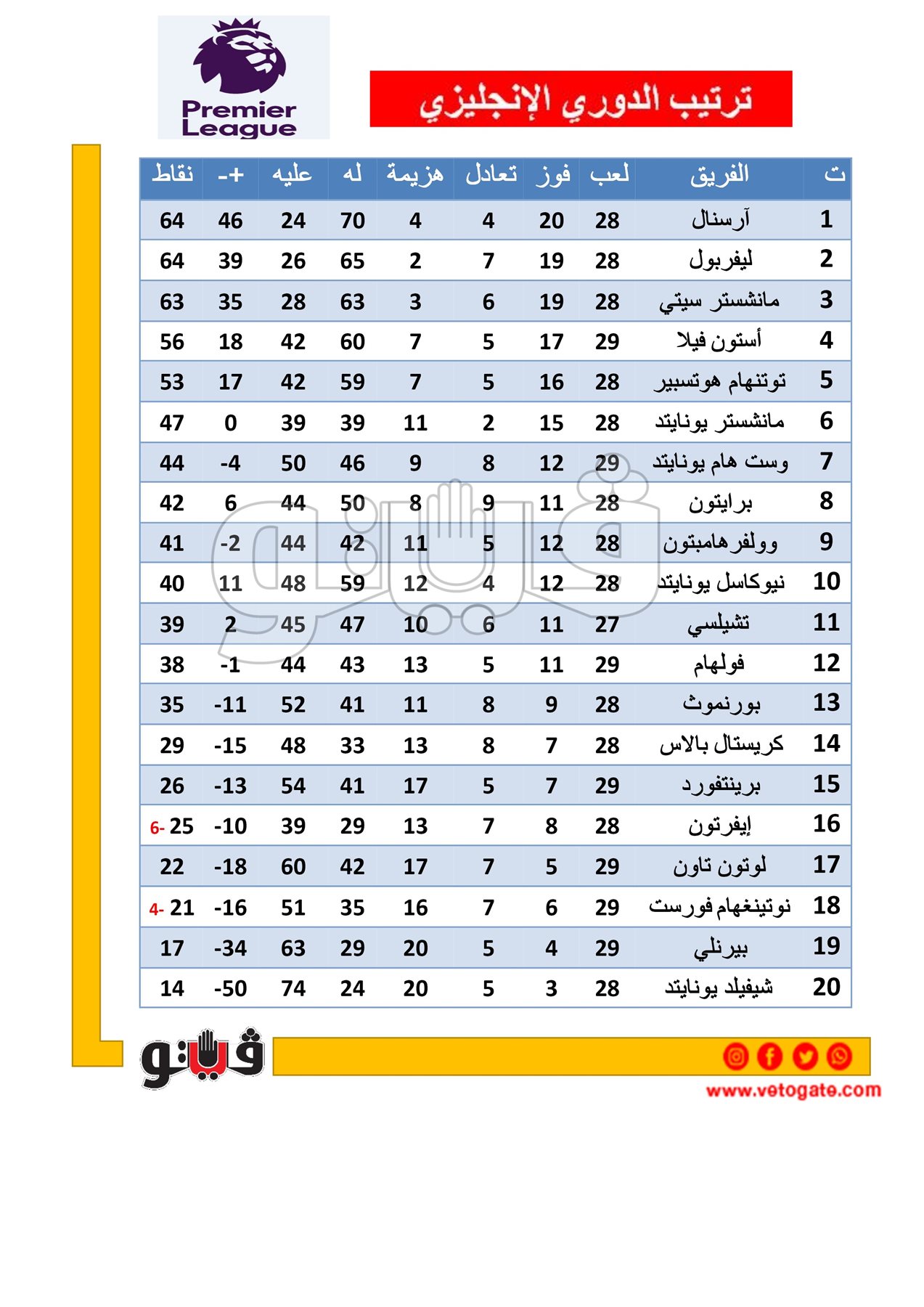 1- آرسنال 64 نقطة