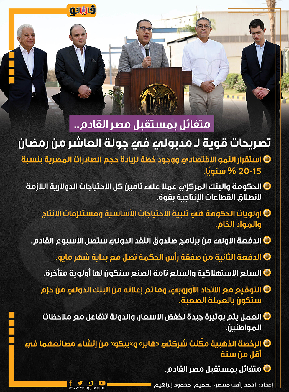 متفائل بمستقبل مصر القادم.. تصريحات قوية لـ مدبولي في جولة العاشر من رمضان (إنفوجراف) السبت 30/مارس/2024 - 08:05 م 3/30/2024 8:05:22 PM أحمد رأفت منتصر شارك طباعة 18 حجم الخط شارك طباعة