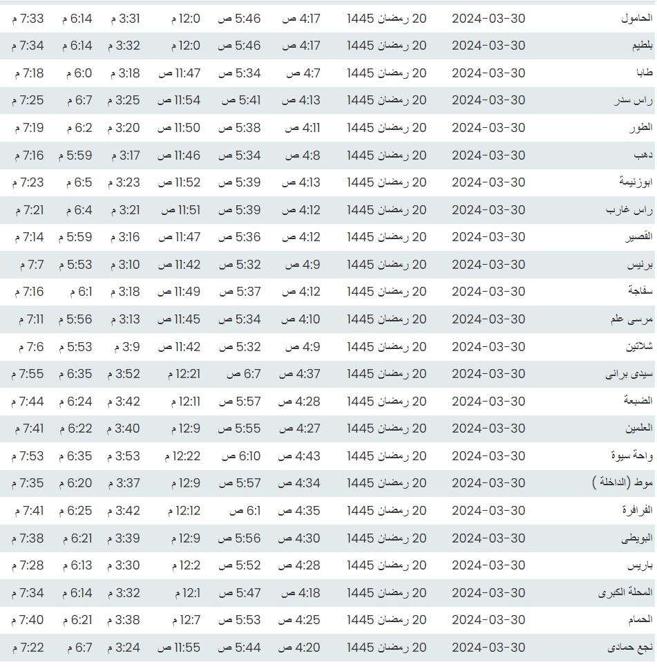 وفيما يلي مواقيت الصلاة، لعدد من مدن ومحافظات الجمهورية من واقع بيانات الهيئة العامة للمساحة