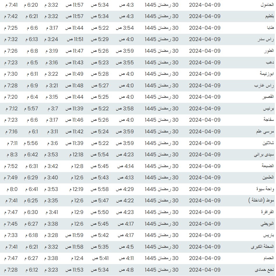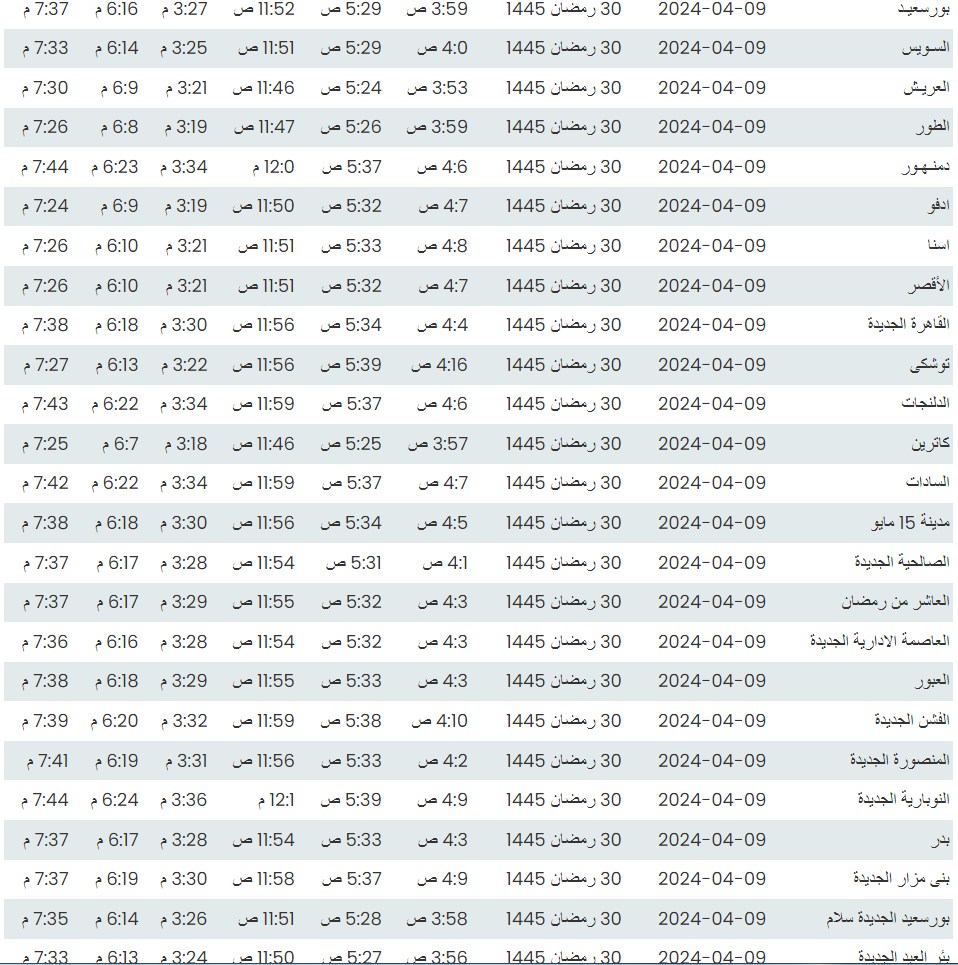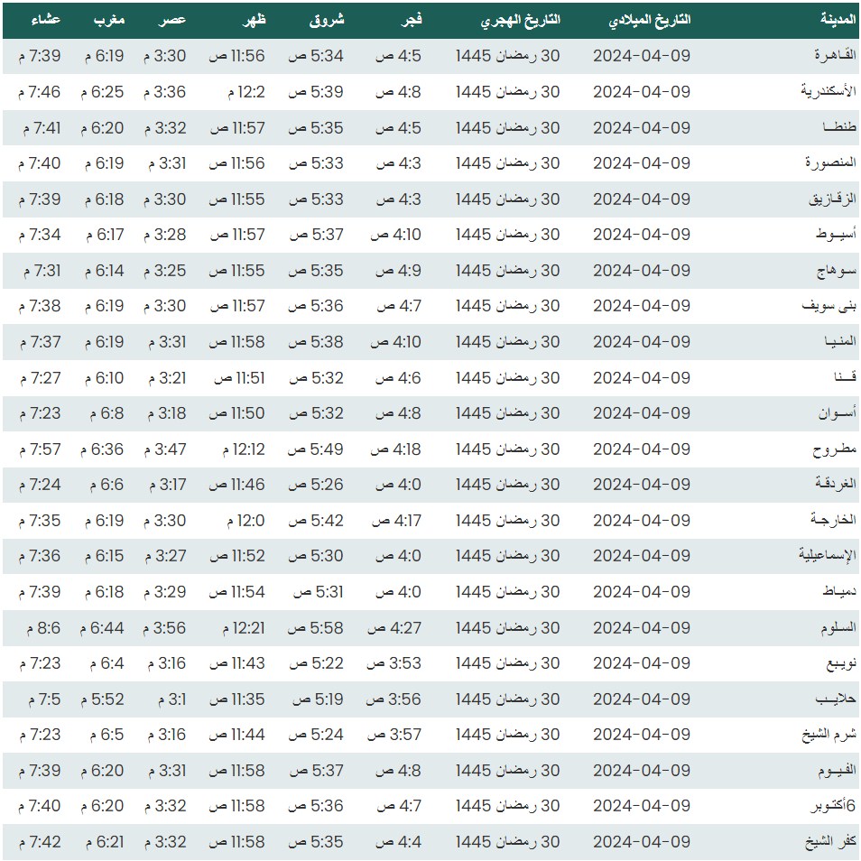 وفيما يلي مواقيت الصلاة، لعدد من مدن ومحافظات الجمهورية من واقع بيانات الهيئة العامة للمساحة