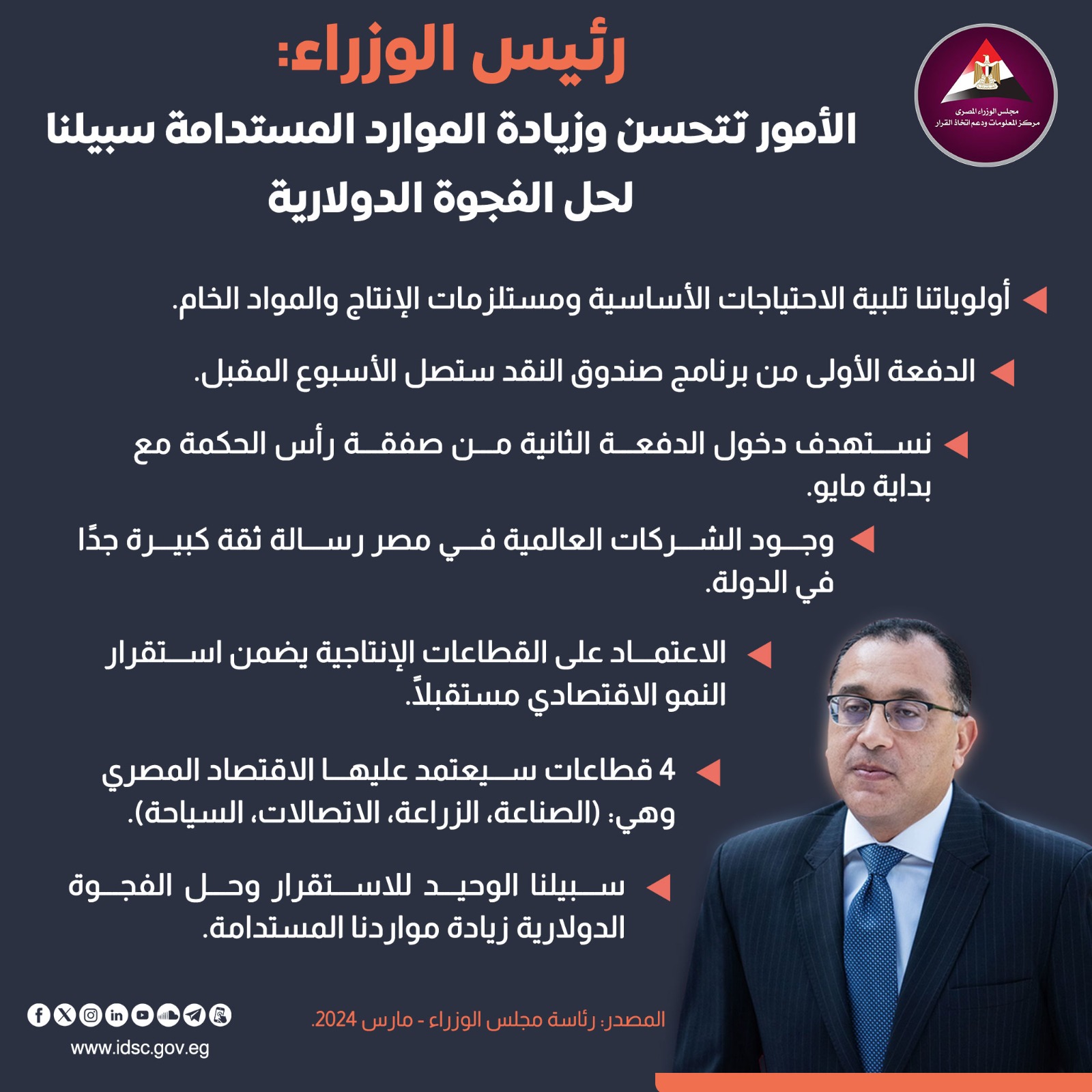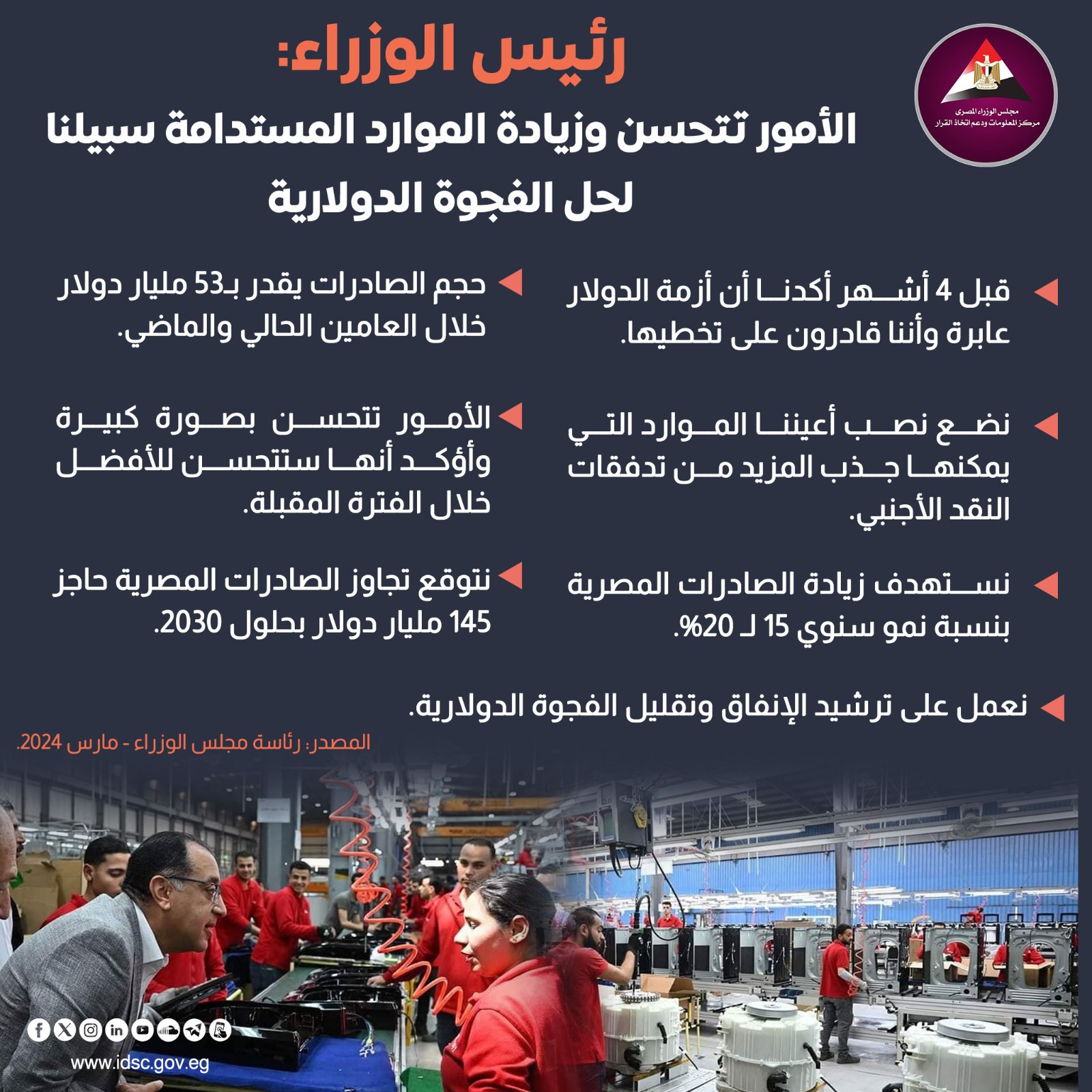 وأكد رئيس الوزراء، في تصريحات صحفية على هامش زيارته لمدينة العاشر من رمضان أن صادرات مصر ستتجاوز 145 مليار دولار خلال الست سنوات القادمة، موضحًا أن الدفعة الأولى من قيمة قرض صندوق النقد الدولي ستصل الأسبوع القادم، كما أن الدفعة الثانية من صفقة تطوير رأس الحكمة ستصل مع بداية مايو المقبل.