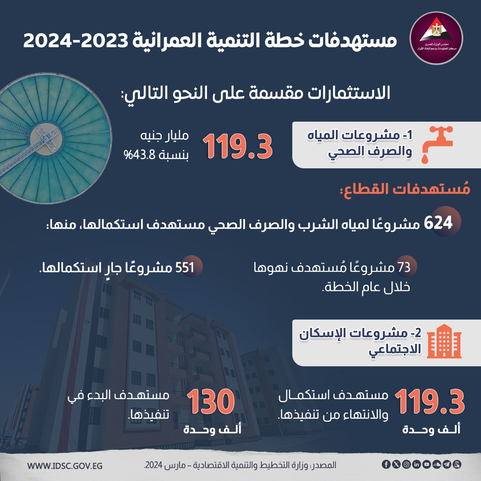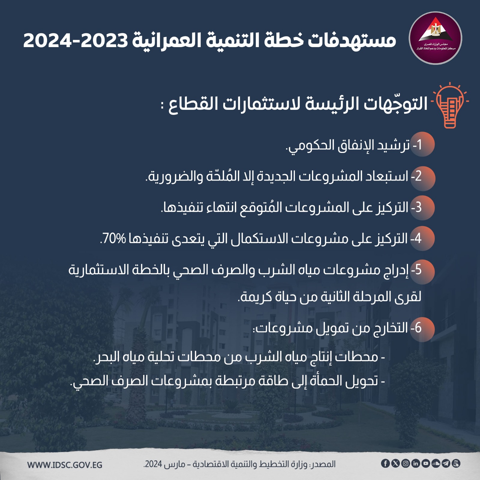 كشفت الصفحة الرسمية لمركز المعلومات ودعم اتخاذ القرار بمجلس الوزراء على موقع التواصل الاجتماعي "فيسبوك" عن مستهدفات خطة التنمية العمرانية 2023 - 2024م.