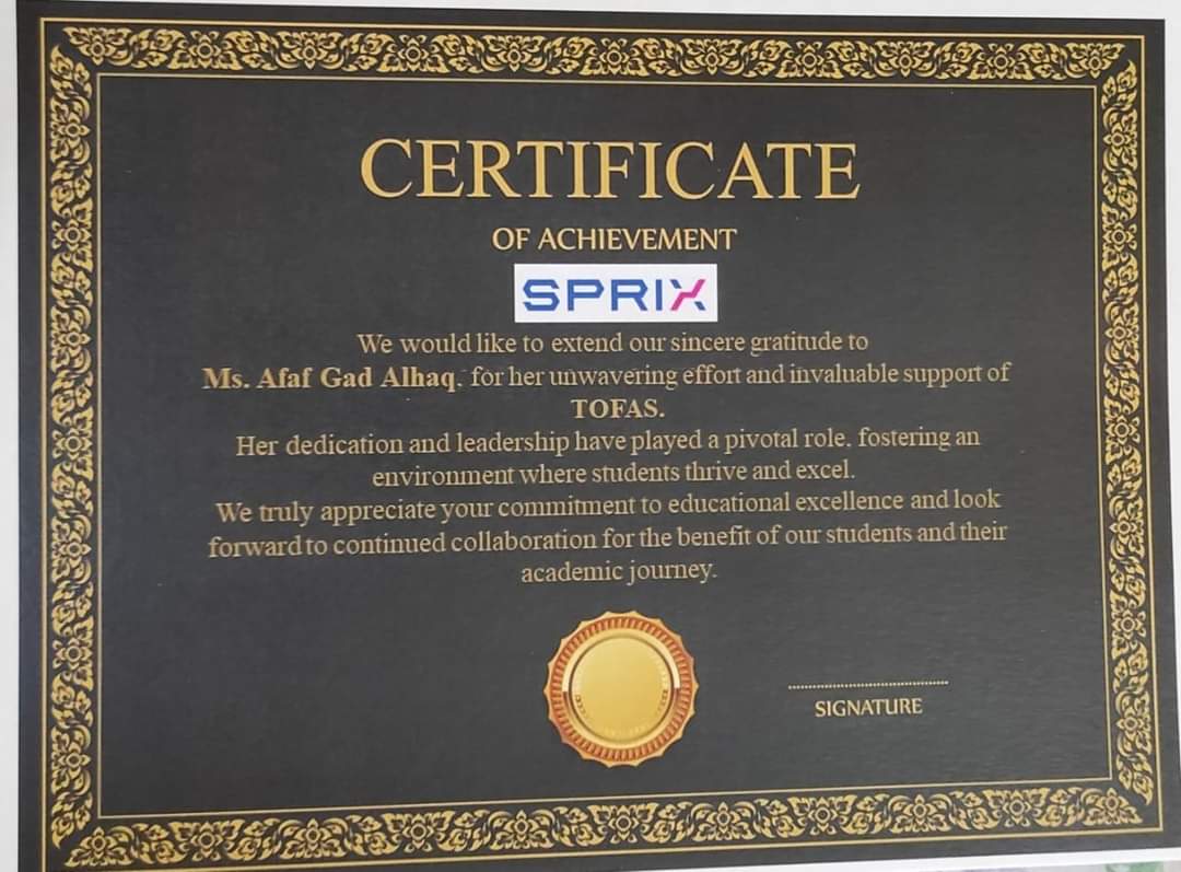 وأهدت المؤسسة اليابانية Sprix شهادة فحواها "نود أن نعرب عن خالص امتناننا للسيدة عفاف جاد الحق. لجهودها الثابتة ودعمها الذي لا يقدر بثمن في توفاس، لقد لعب تفانيها وقيادتها دورًا محوريًا في تعزيز البيئة التي يزدهر فيها الطلاب ويتفوقون، نحن نقدر حقًا التزامك بالتميز التعليمي والمظهر ونتطلع إلى التعاون المستمر لما فيه مصلحة طلابنا وأبنائهم"