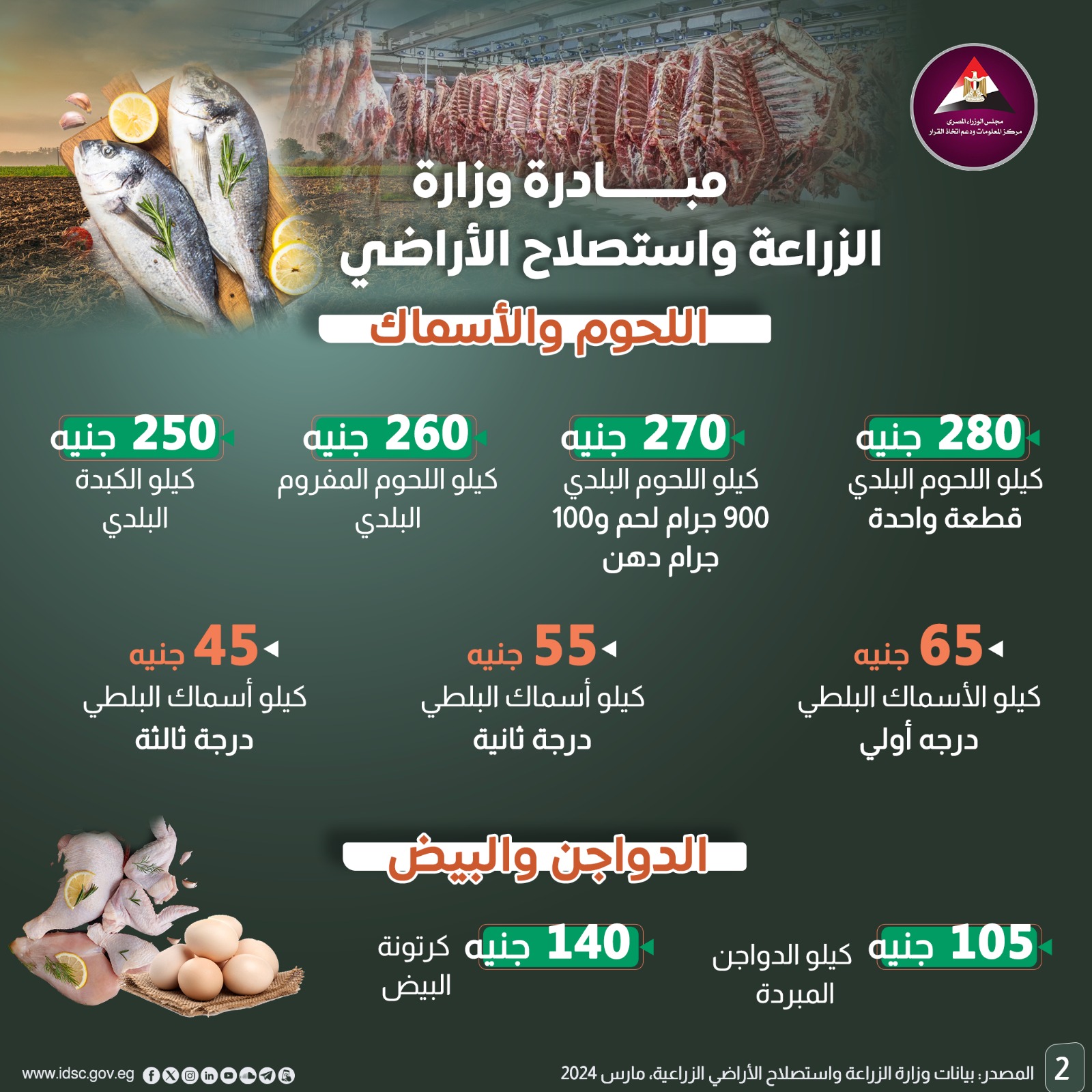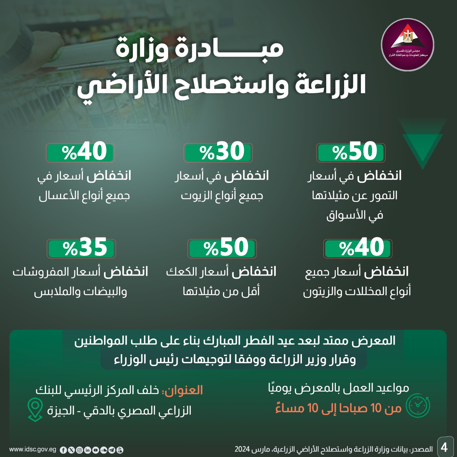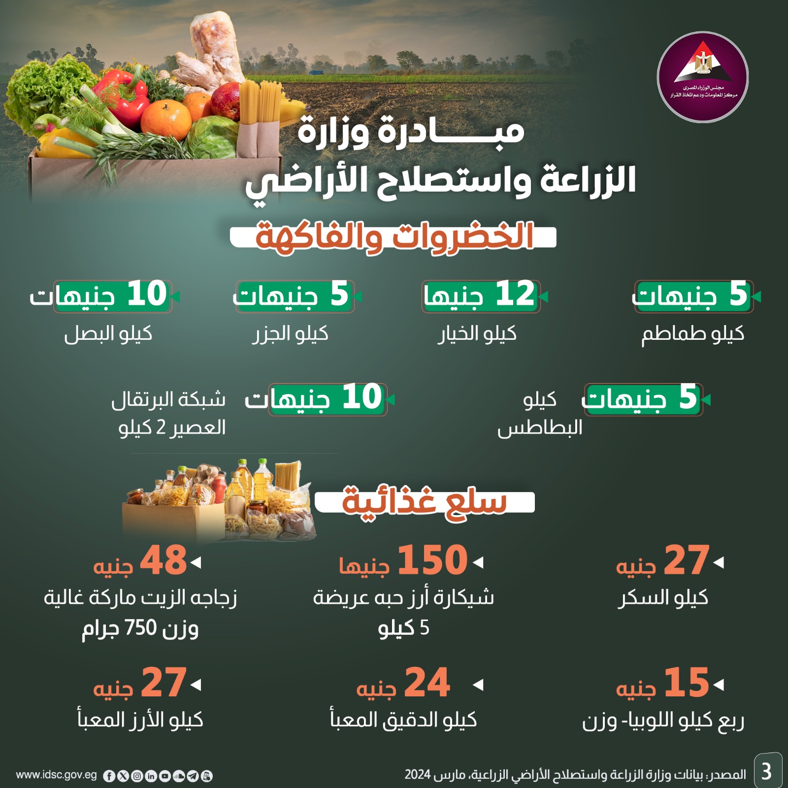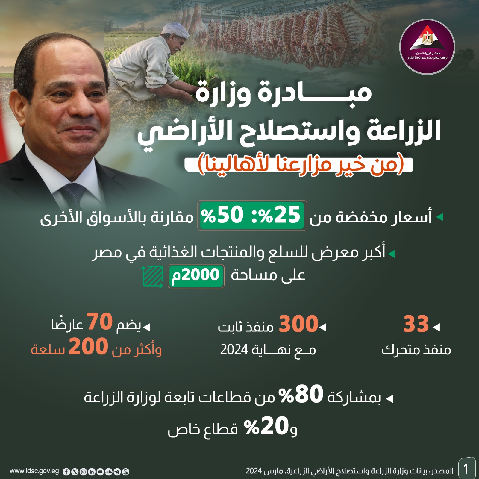 كشفت الصفحة الرسمية لمركز المعلومات ودعم اتخاذ القرار بمجلس الوزراء على موقع التواصل الاجتماعي "فيسبوك" عن مبادرة وزارة الزراعة واستصلاح الأراضي من خير مزارعنا لأهالينا.