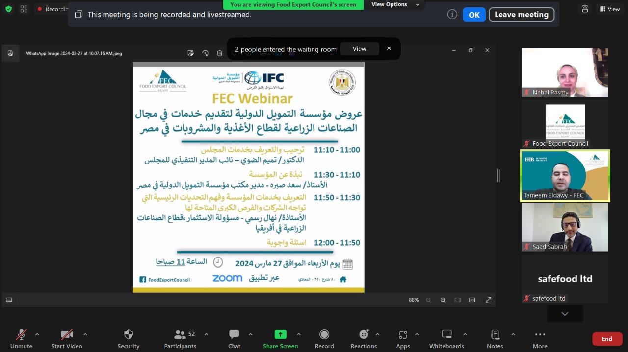 جاء ذلك خلال اللقاء الذى نظمه المجلس التصديري للصناعات الغذائية، بالتعاون مع مؤسسة التمويل الدولية IFC، ندوة إلكترونية عبر تطبيق زووم تحت عنوان "عروض مؤسسة التمويل الدولية لتقديم خدمات في مجال الصناعات الزراعية لقطاع الأغذية والمشروبات في مصر".