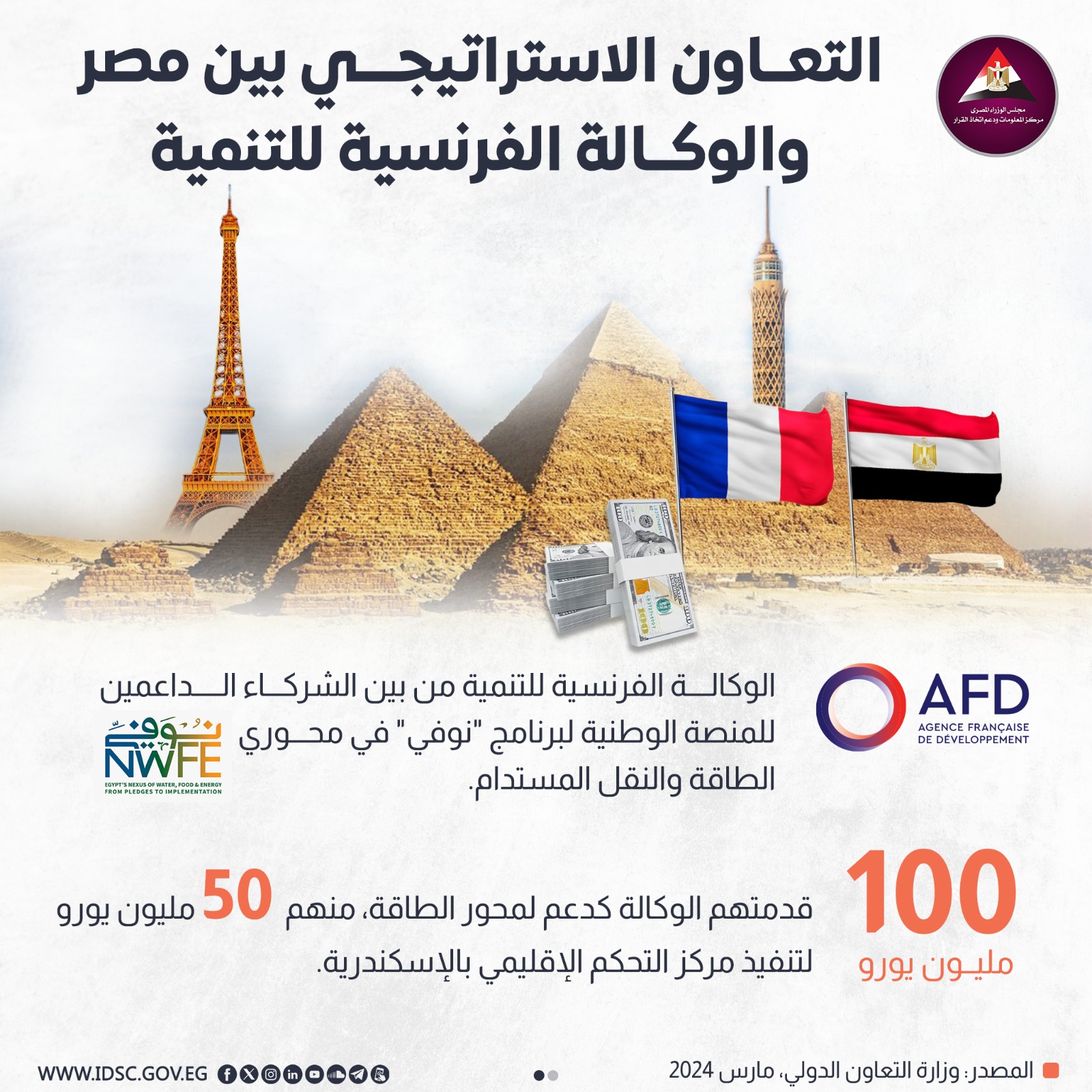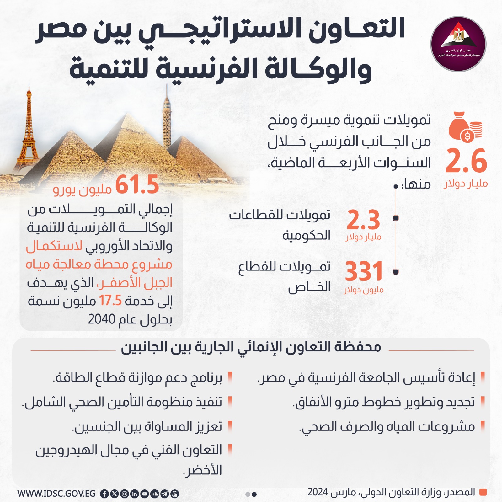 كشفت الصفحة الرسمية لمركز المعلومات ودعم اتخاذ القرار بمجلس الوزراء على موقع التواصل الاجتماعي "فيسبوك" عن حجم التعاون الاستراتيجي بين مصر والوكالة الفرنسية للتنمية.
