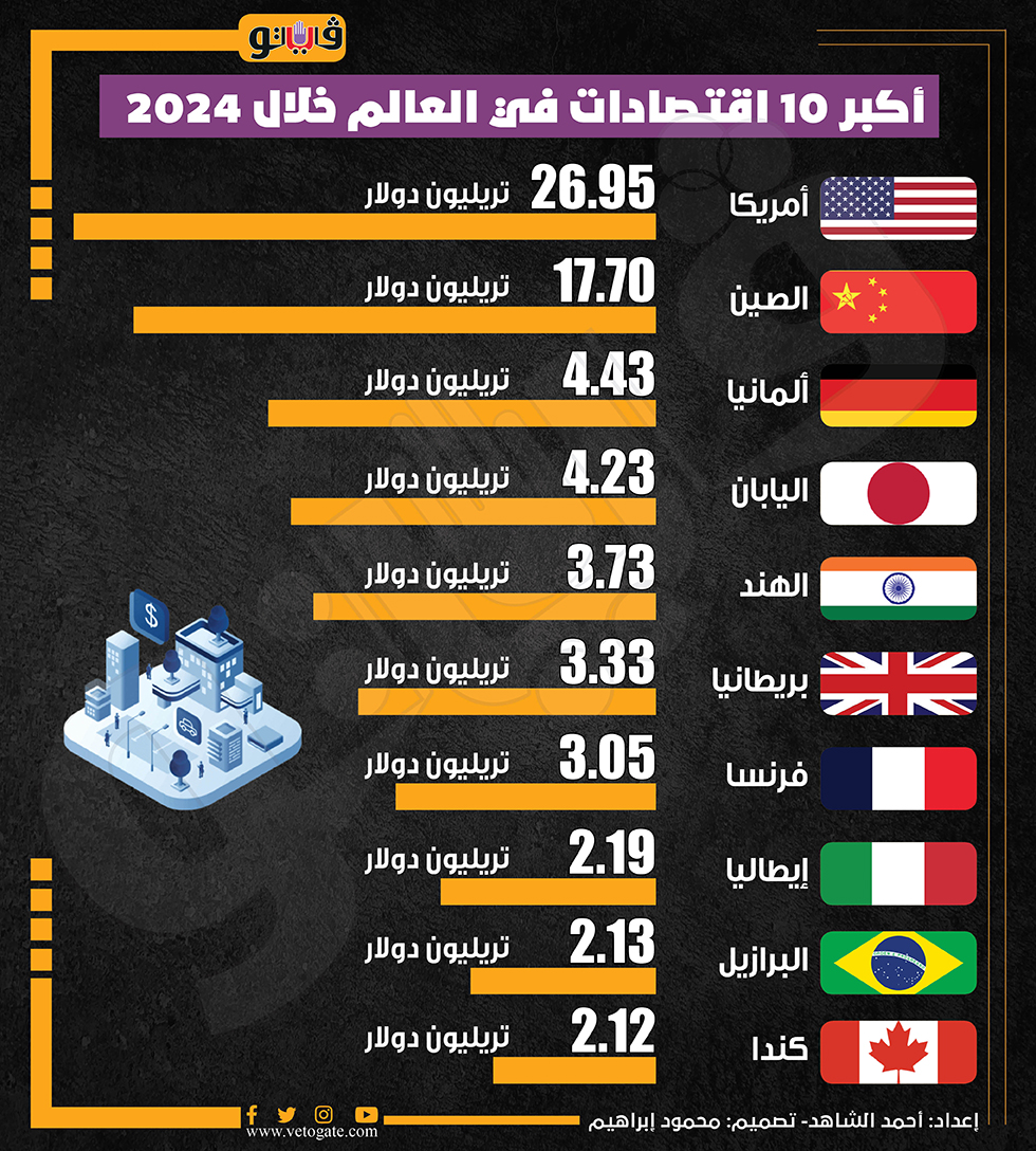 أكبر 10 اقتصادات في العالم خلال 2024 (إنفوجراف) الأربعاء 03/أبريل/2024 - 12:10 ص 4/3/2024 12:10:46 AM الاقتصاد العالمي، فيتو - أحمد الشاهد شارك طباعة 18 حجم الخط شارك طباعة الاقتصاد العالمي أمريكا أكبر الاقتصادات العالمية الصين ألمانيا بريطانيا