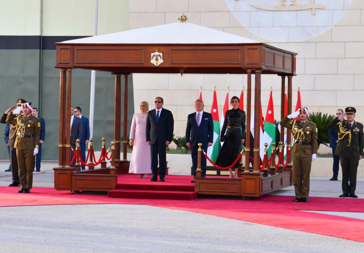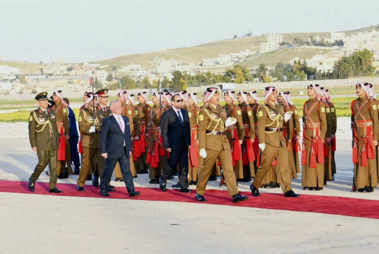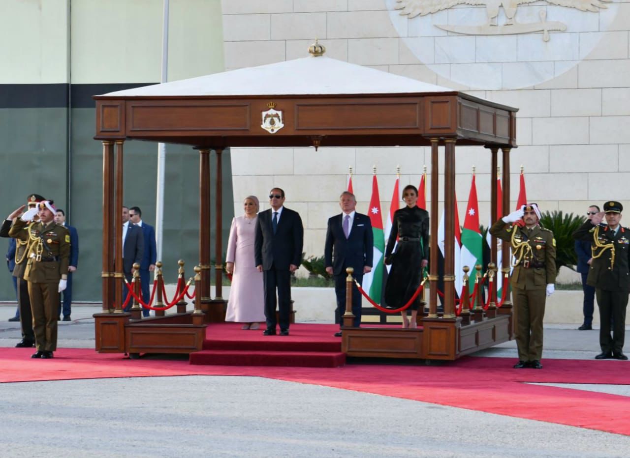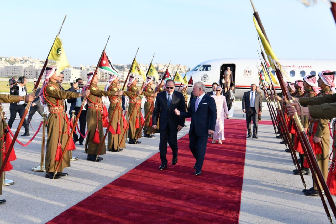 استقبل الملك عبدالله الثاني عاهل الأردن وقرينته الرئيس عبد الفتاح السيسي وقرينته فور وصول الرئيس إلى العاصمة الأردنية عمان