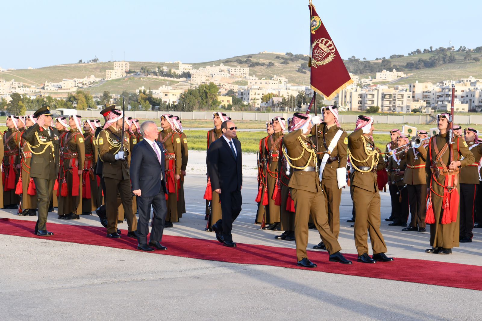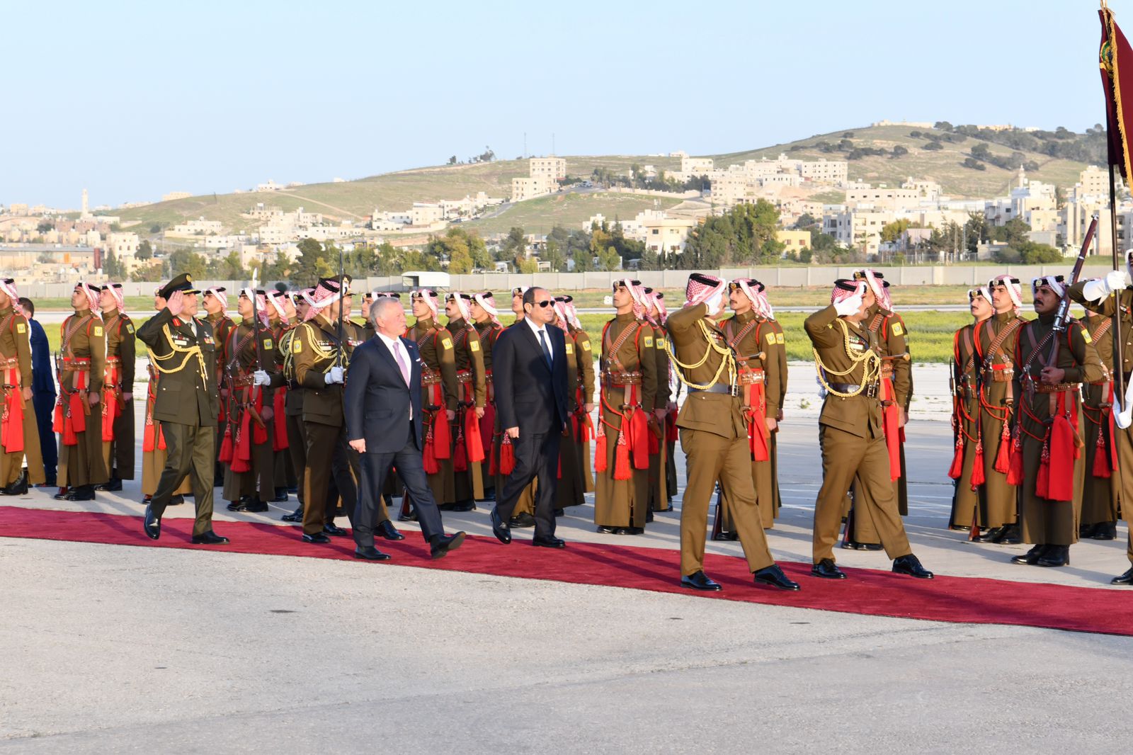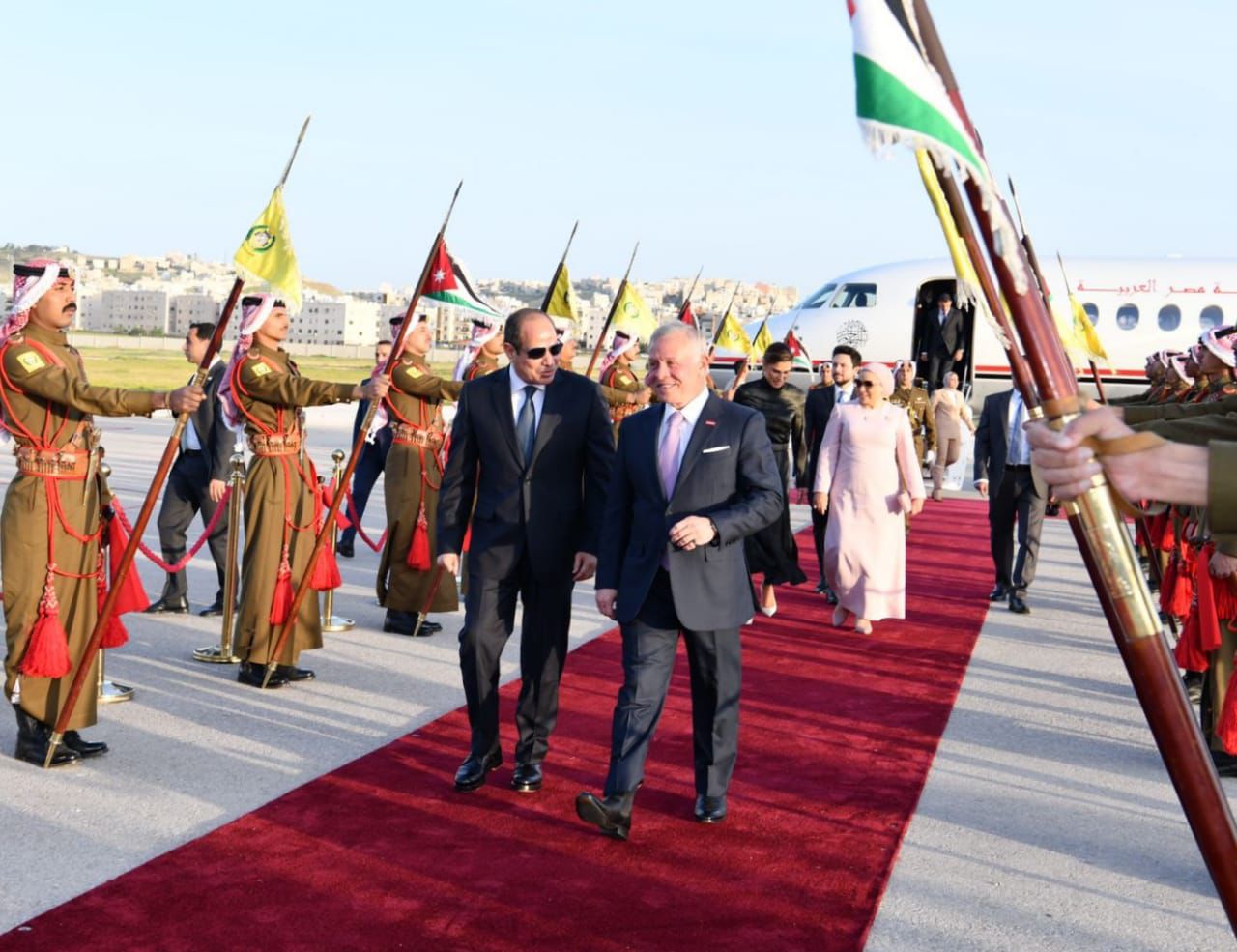 استقبل الملك عبدالله الثاني عاهل الأردن وقرينته الرئيس عبد الفتاح السيسي وقرينته فور وصول الرئيس إلى العاصمة الأردنية عمان