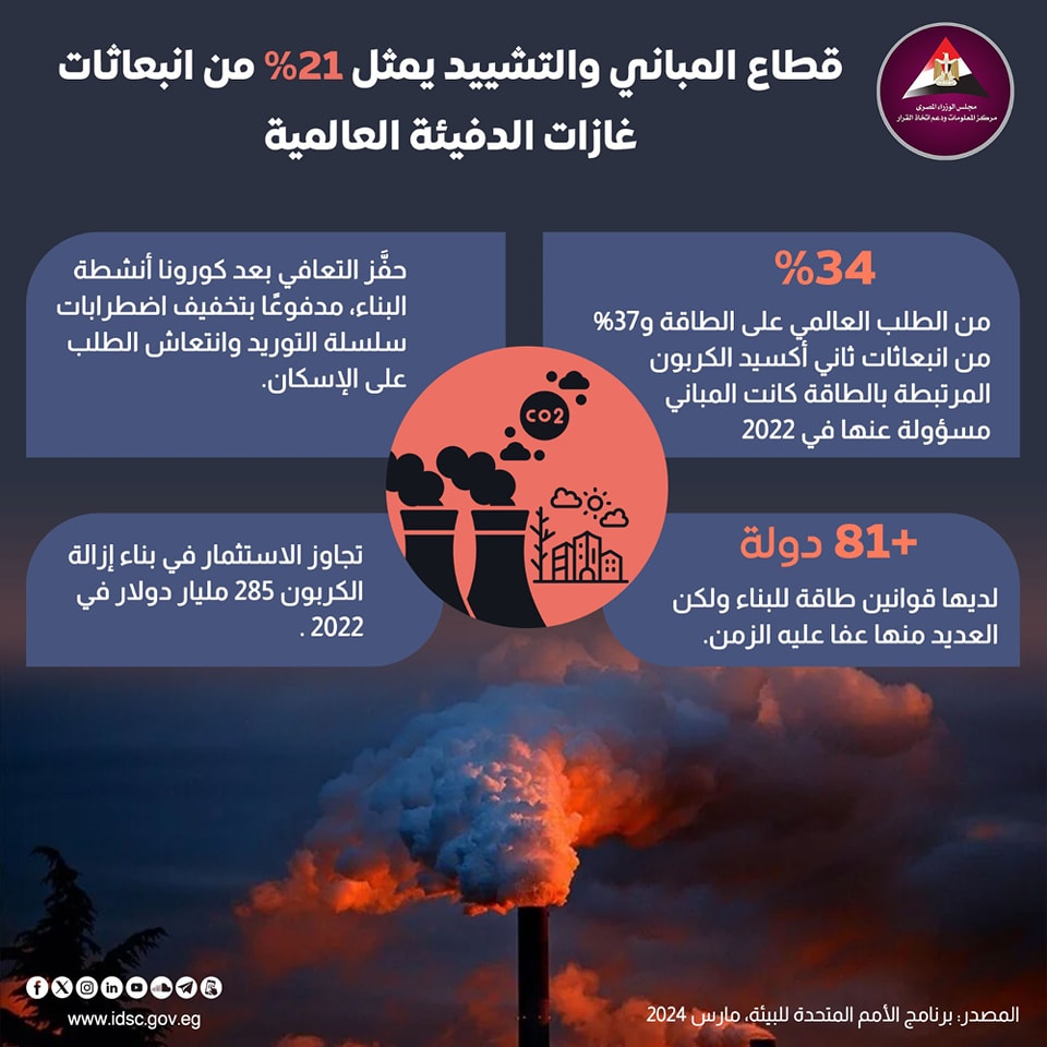 كشفت الصفحة الرسمية لمركز المعلومات ودعم اتخاذ القرار بمجلس الوزراء على موقع التواصل الاجتماعي "فيسبوك" عن الانبعاثات الدفيئة الناتجة عن قطاع المباني والتشييد.