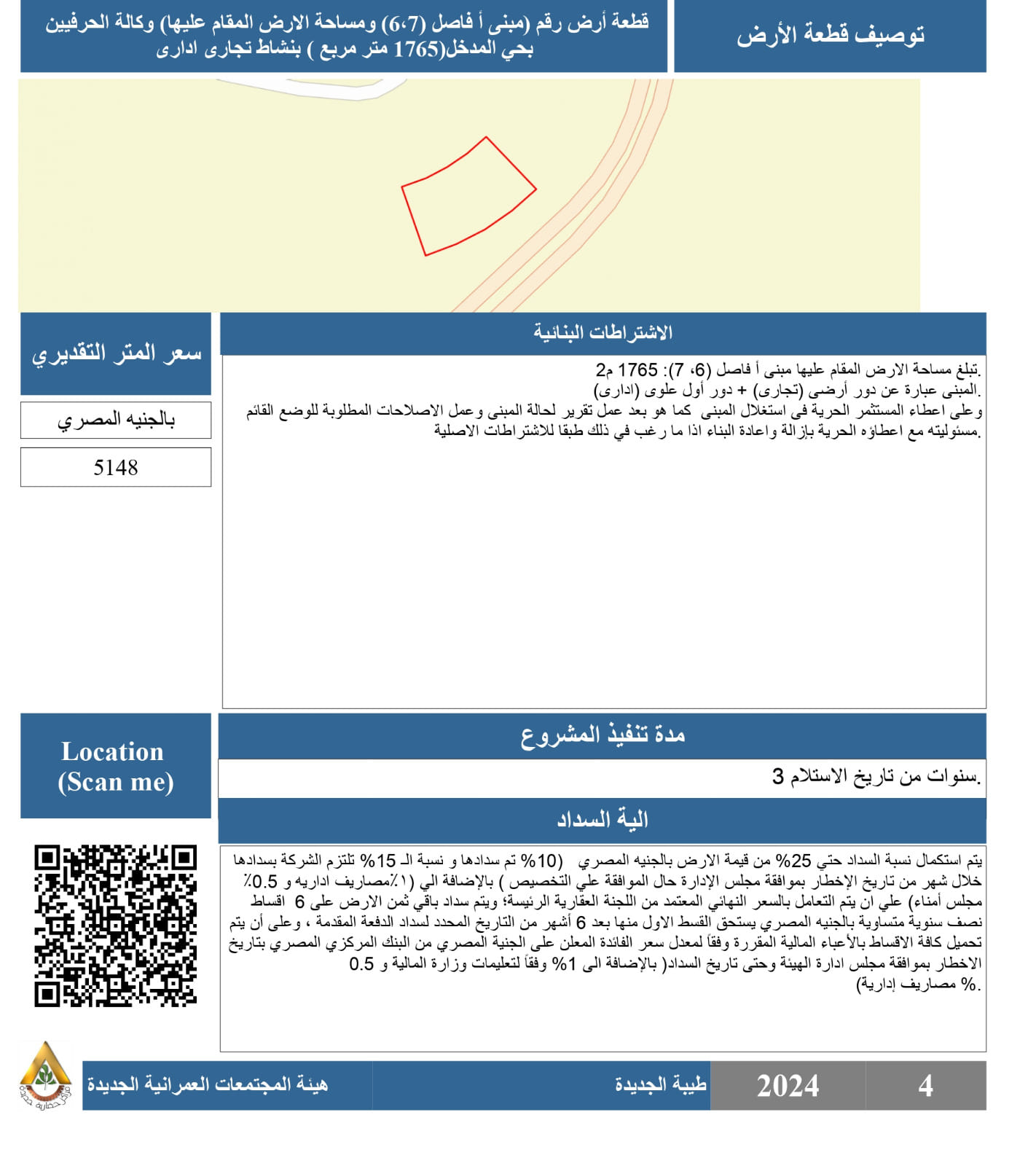 وأوضح أن الطرح يضم قطعة أرض رقم ( ٤٤ ) بمساحة ١٠٤٤ م٢ بنشاط تجارى إداري سكنى بمركز خدمات المدينة، وقطعة أرض بمساحة ١٧٧٢٧ م٢ بنشاط نادى اجتماعي بمنطقة النوادي بمنطقة ٤٨٠ فدان، ومبنى ( أ ) فاصل ( ٦، ٧ ) ومساحة الأرض المقام عليها بمساحة ١٧٦٥ م٢ بنشاط تجارى إداري بمبنى وكالة الحرفيين بحى المدخل، وقطعة أرض رقم ( ١٤٨ ) بمساحة ٣٠٠ م٢ بنشاط ورشة حرفية بالمنطقة الصناعية.