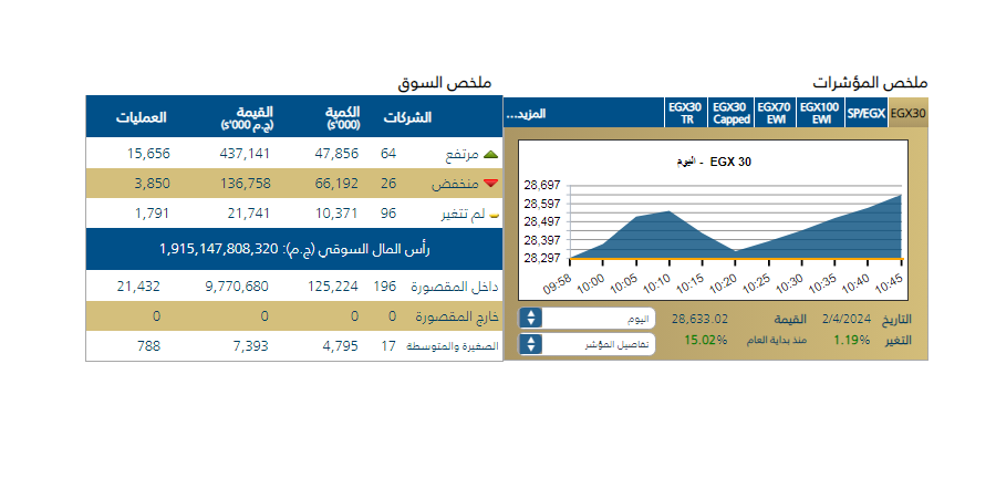 - هبط مؤشر "إيجي إكس 30" بنسبة 2.36 % عند مستوى 27559 نقطة.