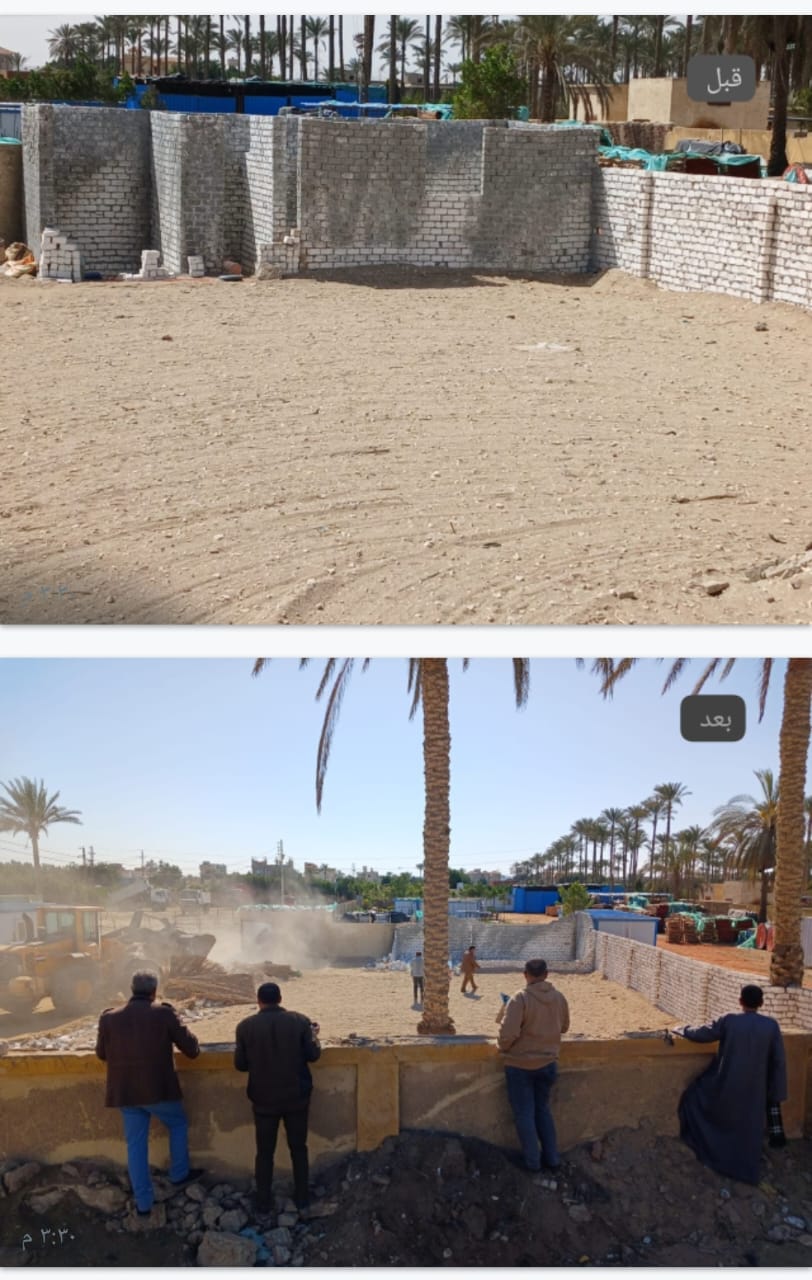 وفي مركز ومدينة البدرشين تم إزالة حالتين تعدى بالبناء المخالف علي الأراضي الزراعية الأولى بقرية منشأة دهشور عبارة عن سور من البلوك على مساحة ٥٢٥ م٢ والثانية بناء مخالف عبارة عن أعمدة خرسانية وحوائط من الطوب الاحمر على مساحة ١٠٠ م٢ بإجمالي مساحة ٦٢٥ م٢ وتم اتخاذ الإجراءات القانونية ضد المخالفين.
