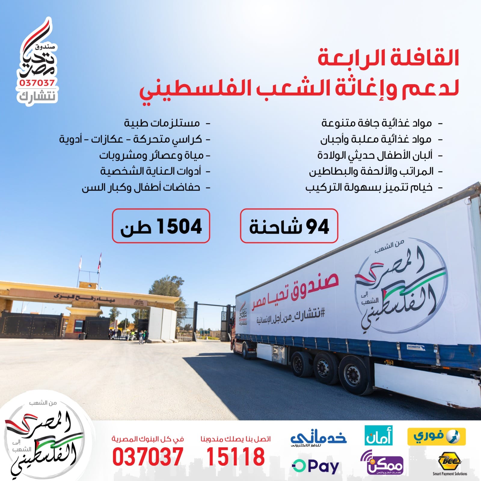 أطلق صندوق تحيا مصر ظهر يوم الإثنين القافلة الرابعة لإغاثة أهل غزة، محملة بكميات ضخمة من المساعدات الغذائية وكافة الاحتياجات الأساسية تحت شعار "نتشارك من أجل الإنسانية"، تنفيذًا لتوجيهات الرئيس عبد الفتاح السيسي رئيس الجمهورية، إيمانًا بأهمية التضامن الإنساني في ظل الظروف العصيبة التي يمر بها الشعب الفلسطيني.
